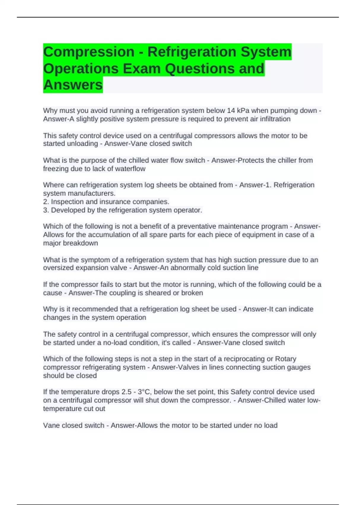 Why must you avoid running a refrigeration system below 14 kPa when pumping down - Answer-A slightly positive system pressure is required to prevent air infiltration This safety control device used on a centrifugal compressors allows the motor to be started unloading - Answer-Vane closed switch What is the purpose of the chilled water flow switch - Answer-Protects the chiller from freezing due to lack of waterflow Where can refrigeration system log sheets be obtained from - Answer-1. Refrigeration system manufacturers. 2. Inspection and insurance companies. 3. Developed by the refrigeration system operator. Which of the following is not a benefit of a preventative maintenance program - Answer-Allows for the accumulation of all spare parts for each piece of equipment in case of a major breakdown What is the symptom of a refrigeration system that has high suction pressure due to an oversized expansion valve - Answer-An abnormally cold suction line If the compressor fails to start but the motor is running, which of the following could be a cause - Answer-The coupling is sheared or broken Why is it recommended that a refrigeration log sheet be used - Answer-It can indicate changes in the system operation The safety control in a centrifugal compressor, which ensures the compressor will only be started under a no-load condition, it's called - Answer-Vane closed switch Which of the following steps is not a step in the start of a reciprocating or Rotary compressor refrigerating system - Answer-Valves in lines connecting suction gauges should be closed If the temperature drops 2.5 - 3°C, below the set point, this Safety control device used on a centrifugal compressor will shut down the compressor. - Answer-Chilled water low-temperature cut out Vane closed switch - Answer-Allows the motor to be started under no load