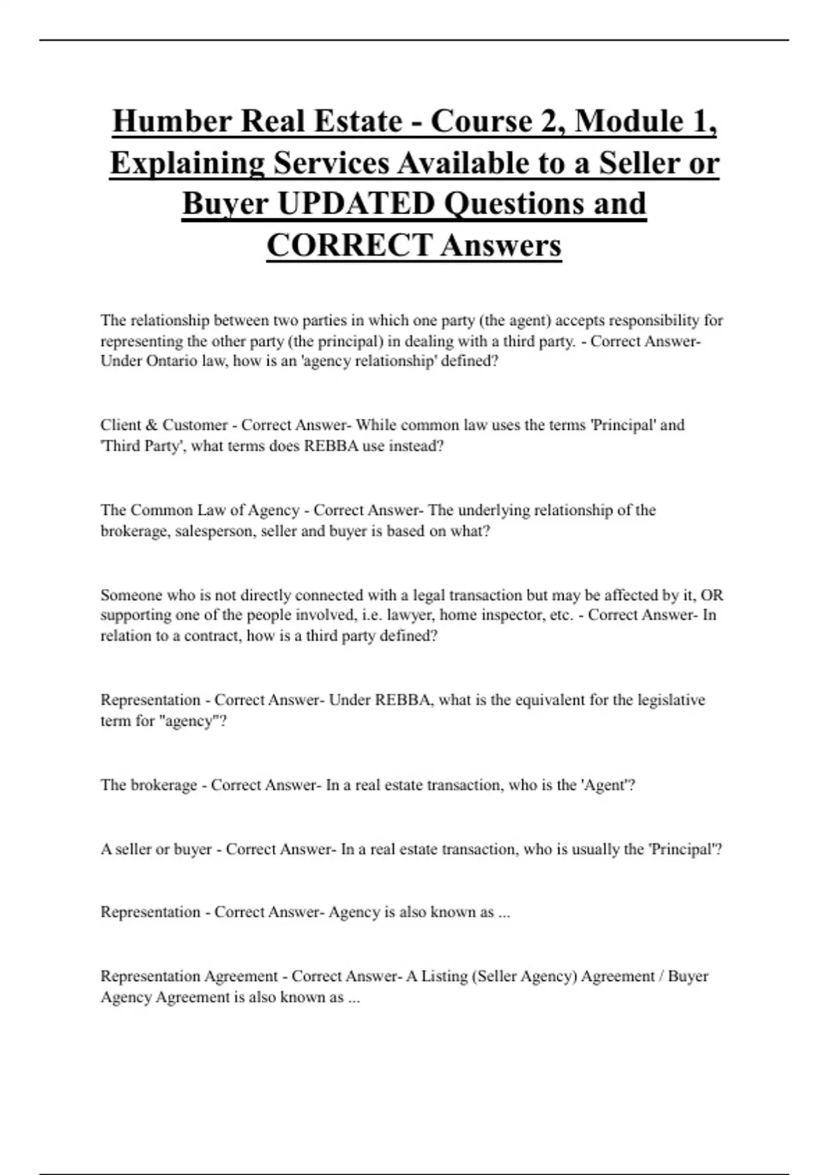 Humber Real Estate - Course 2, Module 1, Explaining Services Available to a Seller or Buyer UPDATED Questions and CORRECT Answers