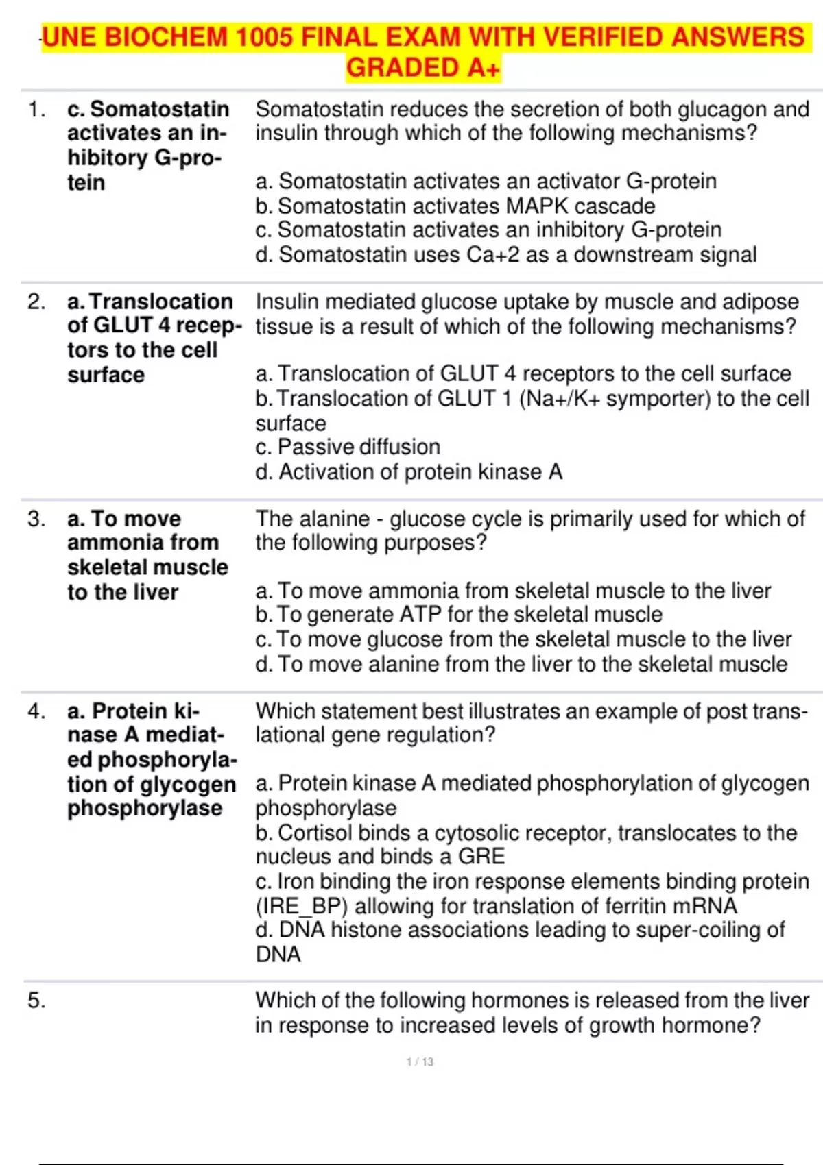 , UNE BIOCHEM 1005 FINAL EXAM WITH VERIFIED ANSWERS