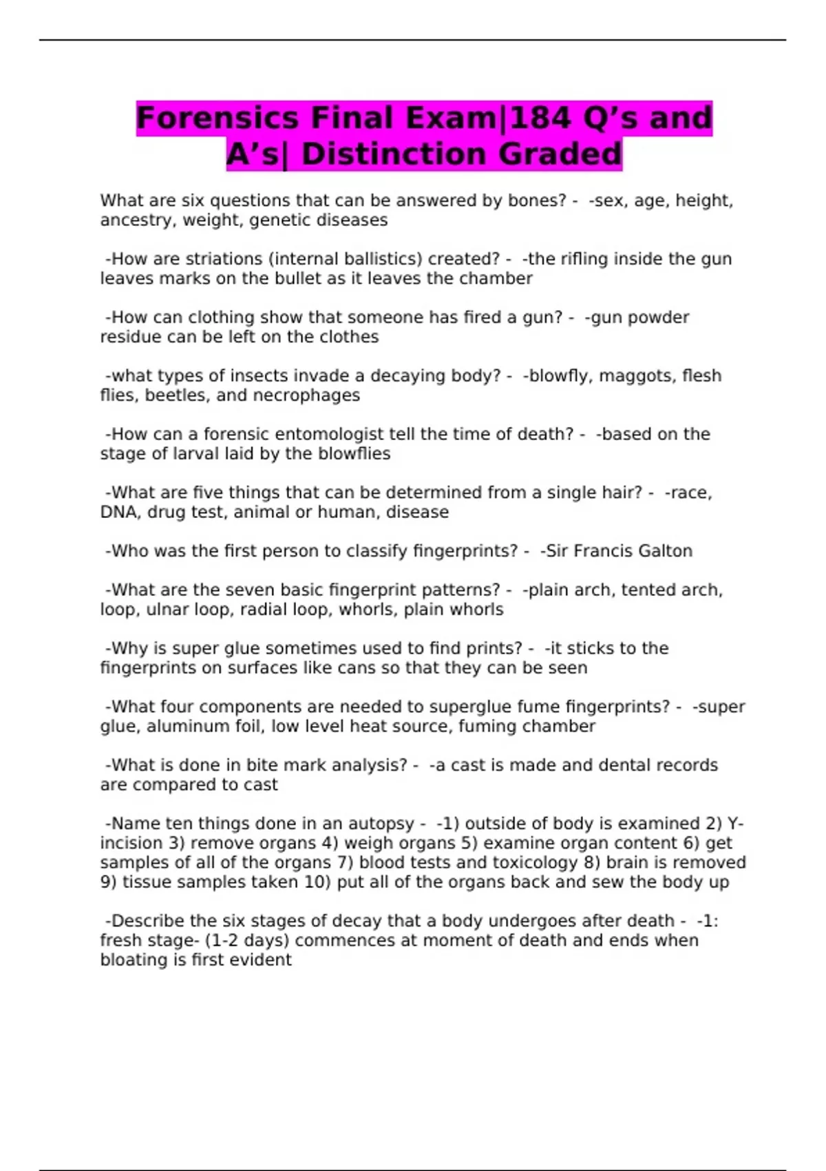 Forensics Final Exam|184 Q’s and A’s| Distinction Graded