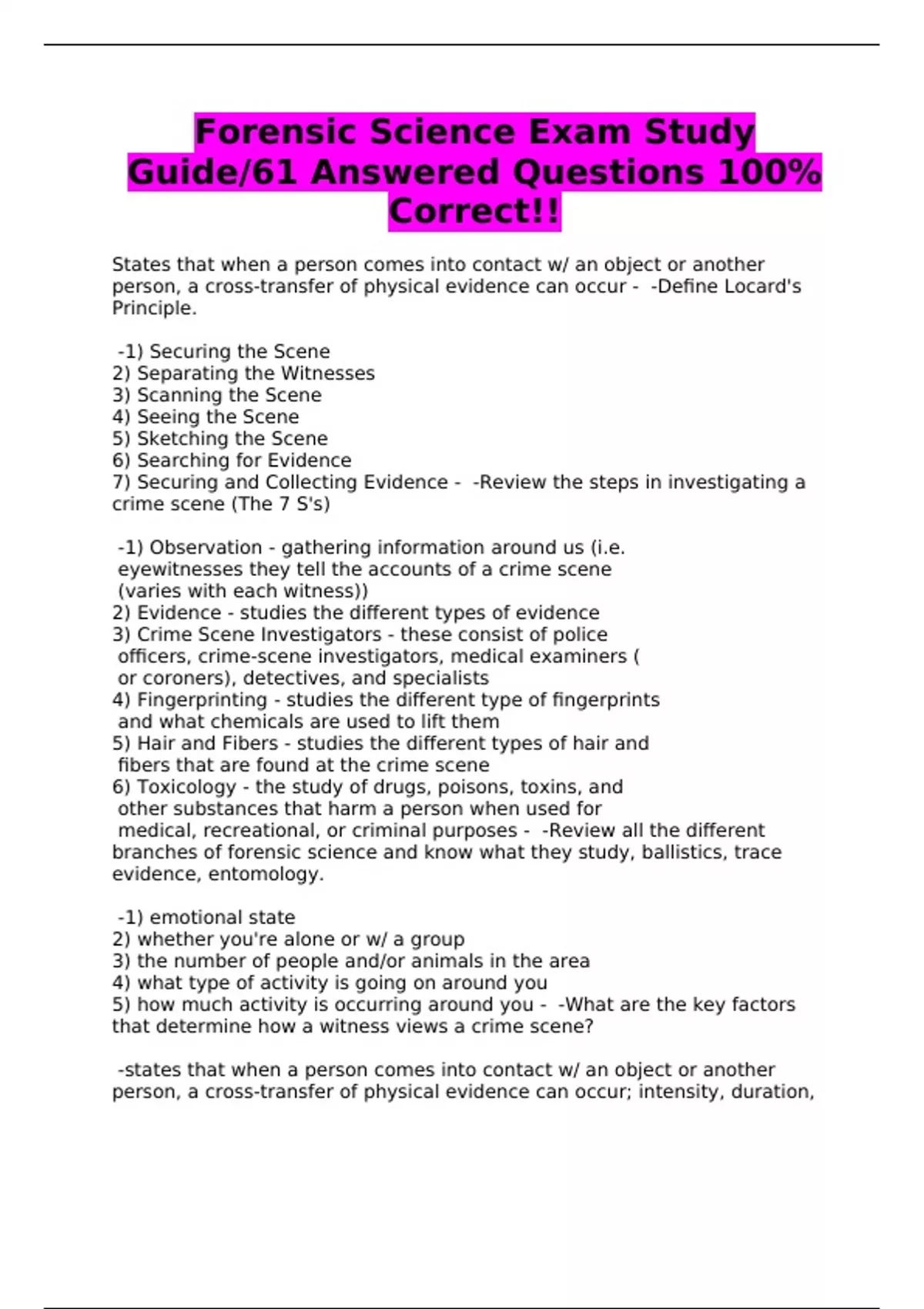 Forensic Science Exam Study Guide/61 Answered Questions 100% Correct!!