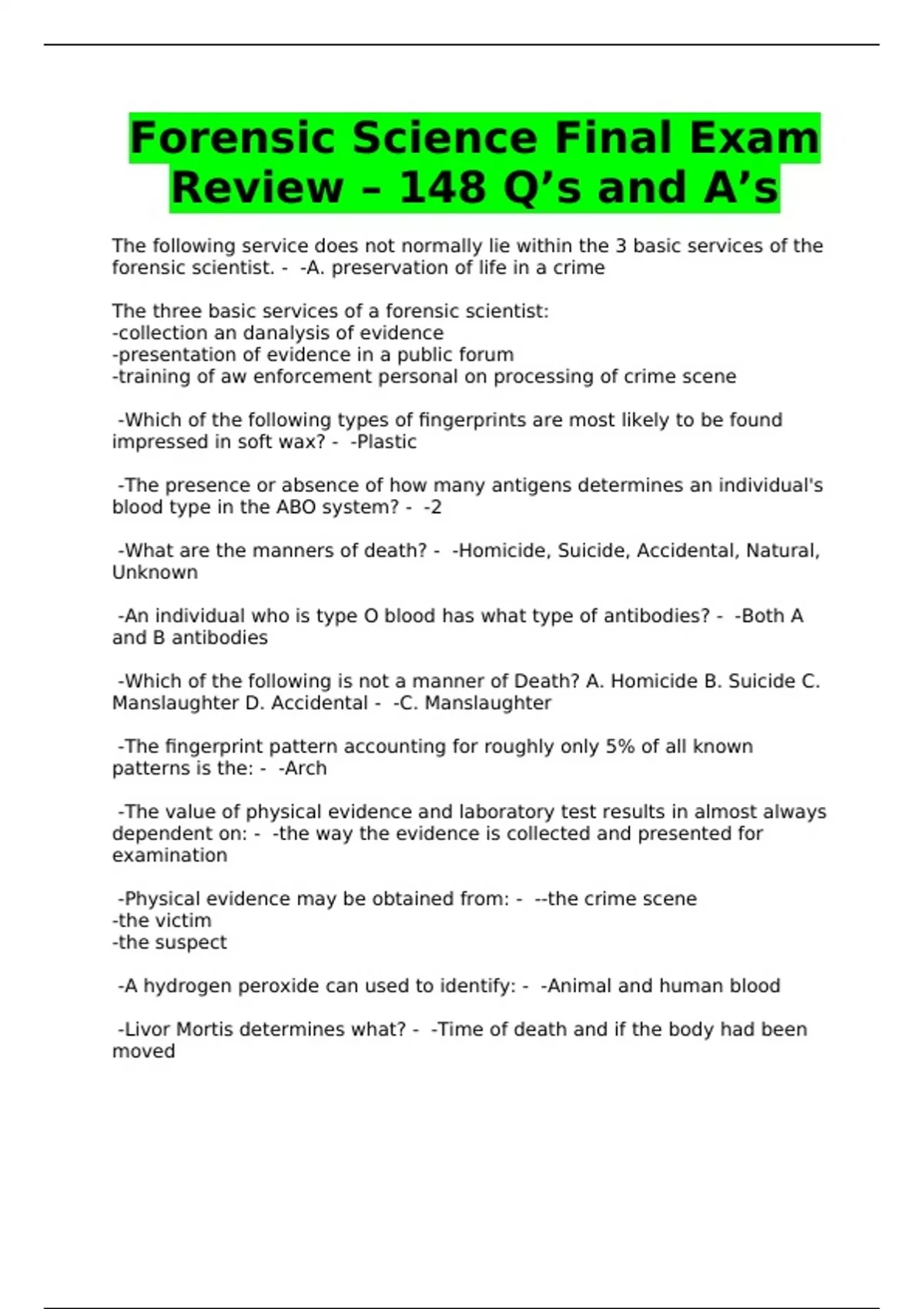 Forensic Science Final Exam Review – 148 Q’s and A’s