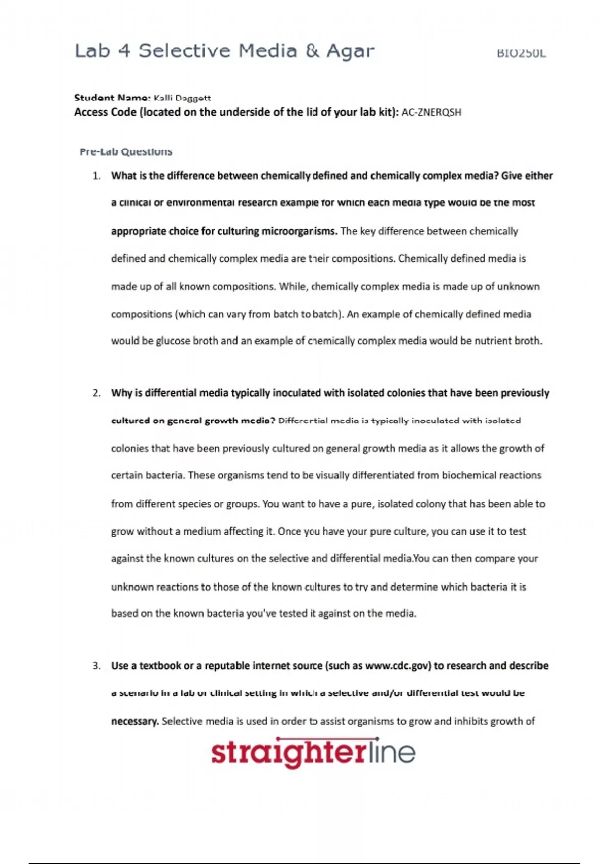 1. What is the difference between chemically defined and chemically complex media? Give either a clinical or environmental research example for which each media type would be the most appropriate choice for culturing microorganisms. The key difference between chemically defined and chemically complex media are their compositions. Chemically defined media is made up of all known compositions. While, chemically complex media is made up of unknown compositions (which can vary from batch to batch). An example of chemically defined media would be glucose broth and an example of chemically complex media would be nutrient broth. 2. Why is differential media typically inoculated with isolated colonies that have been previously cultured on general growth media? Differential media is typically inoculated with isolated colonies that have been previously cultured on general growth media as it allows the growth of certain bacteria. These organisms tend to be visually differentiated from biochemical reactions from different species or groups. You want to have a pure, isolated colony that has been able to grow without a medium affecting it. Once you have your pure culture, you can use it to test against the known cultures on the selective and differential media.You can then compare your unknown reactions to those of the known cultures to try and determine which bacteria it is based on the known bacteria you've tested it against on the media.