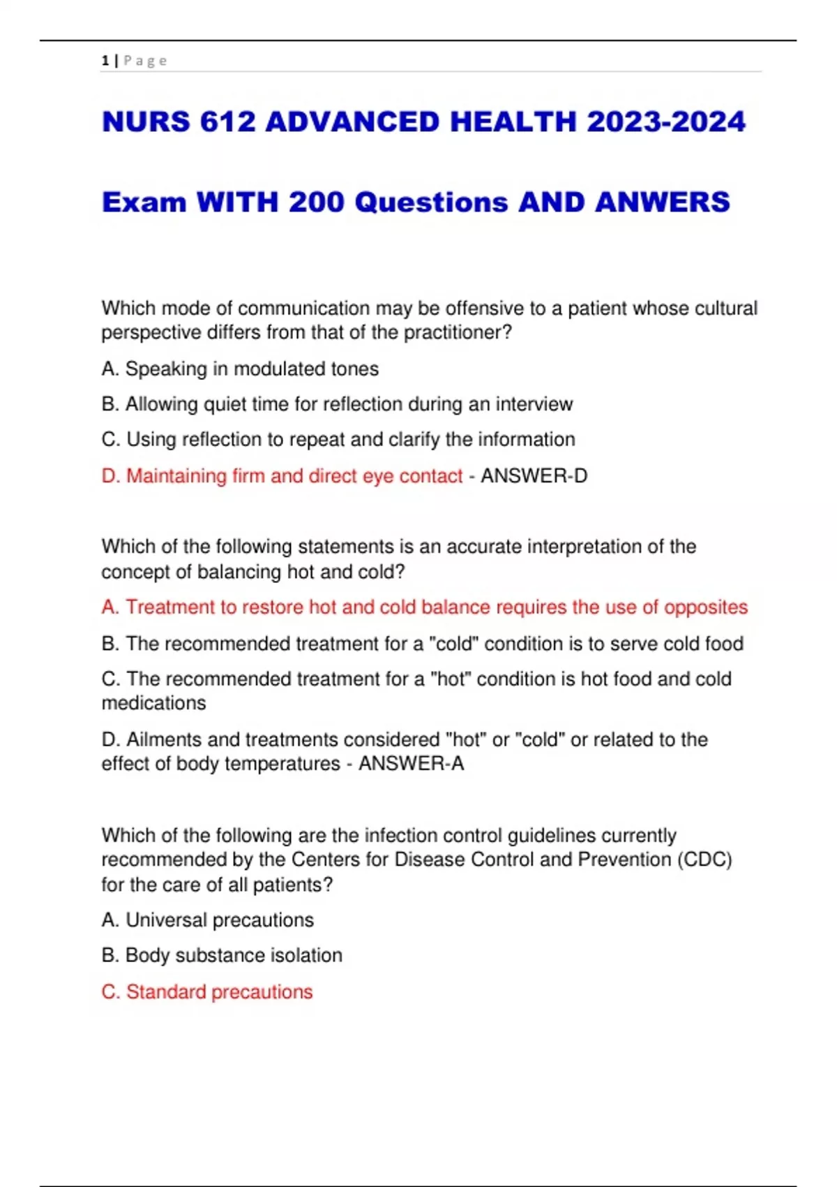 NURS 612 ADVANCED HEALTH Exam WITH 200 Questions AND ANWERS Which mode of communication may be offensive to a patient whose cultural perspective differs from that of the practitioner? A. Speaking in modulated tones B. Allowing quiet time for reflection during an interview C. Using reflection to repeat and clarify the information D. Maintaining firm and direct eye contact - ANSWER-D Which of the following statements is an accurate interpretation of the concept of balancing hot and cold? A. Treatment to restore hot and cold balance requires the use of opposites B. The recommended treatment for a "cold" condition is to serve cold food C. The recommended treatment for a "hot" condition is hot food and cold medications D. Ailments and treatments considered "hot" or "cold" or related to the effect of body temperatures - ANSWER-A Which of the following are the infection control guidelines currently recommended by the Centers for Disease Control and Prevention (CDC) for the care of all patients? A. Universal precautions B. Body substance isolation C. Standard precautions 2 | P a g e D. Illness-based precautions - ANSWER-C A patient states that even after he urinates he doesn't feel like his bladder is really empty. Which instrument can be used to determine if his bladder is incompletely empties? A. Calipers B. Tape measure C. Tympanometer D. Portable ultrasound transilluminator - ANSWER-D How does infection control practices in an outpatient setting such as a planet compare with that in an acute care setting? A. Transmission Dash based precautions are not used in an outpatient setting B. Infection control is limited to protecting healthcare providers in the outpatient setting C. The spread of infection to other patients is not a concern in the outpatient setting D. Infection control practices is the same in acute and outpatient settings - ANSWER-D For which purpose is a transillumination an appropriate examination technique? A. Assessment of vesicles on the skin B. Detection of fluid within the sinuses C. Measurement a bone density in the skull D. Determination of a mass in the liver - ANSWER-B 3 | P a g e Which of the following instruments is used in conjunction with a simple nasal speculum to visualize the lower and middle turbinates of the nose? - ANSWER-Penlight On first meeting, the examiner notices that the patient has an obvious odor. Which examination technique is he examiner using in this scenario? - ANSWER-Inspection As a component of palpation, which surface is most sensitive to vibration? A. Fingertips B. Heel of the hand C. Dorsal surface of the hand D. Ulnar surface of the hand - ANSWER-D Which technique is applied throughout the entire examination an interview process? - ANSWER-Inspection The term intensity, when used in relation to percussion tones, refers to A. The loudness of the tone B. The location of the tone C. The musicality of the tone D. The length of duration the tone is heard - ANSWER-A Indirect finger percussion involves striking the middle finger of the non dominant hand with A. The fist B. The percussion hammer 4 | P a g e C. The tip of the middle finger of the dominant hand D. The edge of the stethoscope disk - ANSWER-C A patient has a urinary tract infection. The examiner wishes to assess tenderness over the kidney. Which examination technique is appropriate? A. Light finger palpation over the kidney B. Firm fist percussion over the kidney C. Deep abdominal palpation of the kidney D. Auscultation for kidney bruit - ANSWER-B Which of the following will best facilitate the interview when obtaining a history from a deaf patient who can read lips? A. Speaking loudly B. Speaking slowly C. Using gestures D. Sitting to the side of the patient - ANSWER-B Approximately what percentage of patients interviewed have a sexual orientation other than heterosexual? A. 2% B. 5% C. 10% D. 20% - ANSWER-C During a history, the patient indicates that he has an uncle and a brother with sickle cell disease. Which of the following is an important method by which to document this information? A. Document this as chief complaint