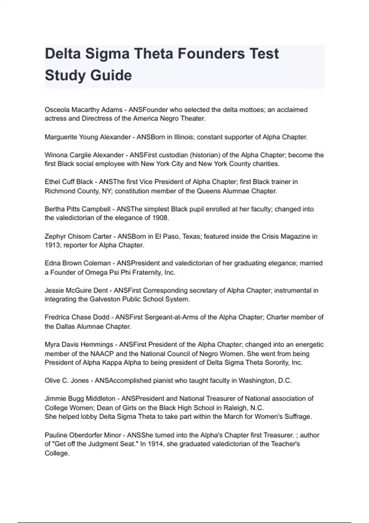 Delta Sigma Theta Founders Test Study Guide Questions And Answers Graded A+ 2024/2025