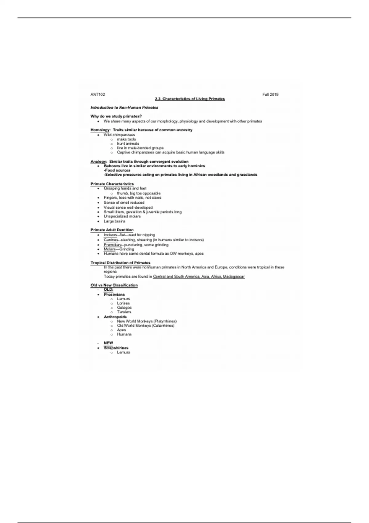 This is a comprehensive and detailed note on characteristics of Primates for Anth 102. *Essential Study Material!! *For you, at a price that's worth it!!