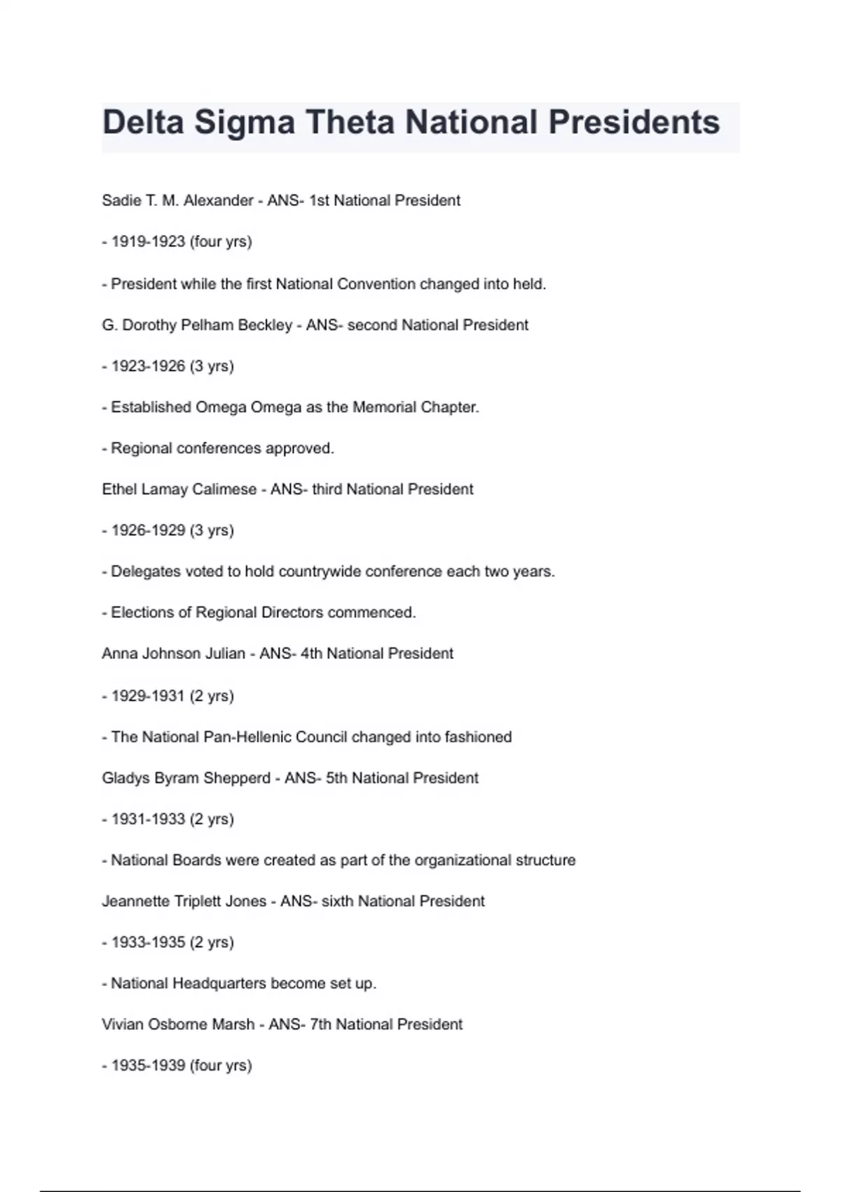 Delta Sigma Theta National Presidents Questions And Answers Graded A+ 2024/2025