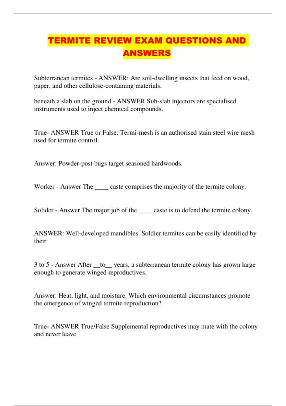 TERMITE REVIEW EXAM QUESTIONS AND