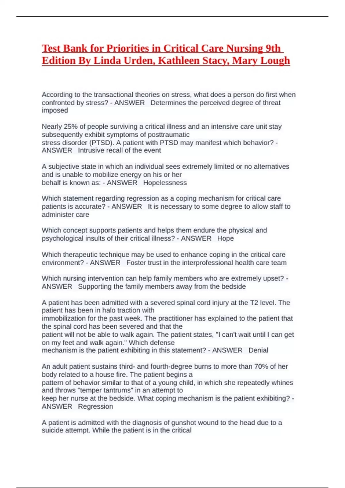 psychological insults of their critical illness? - ANSWER Hope