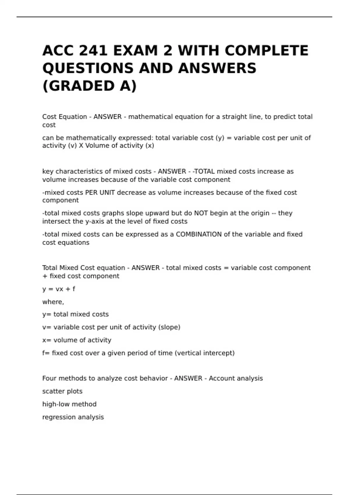 Total Mixed Cost equation - ANSWER - total mixed costs = variable cost component