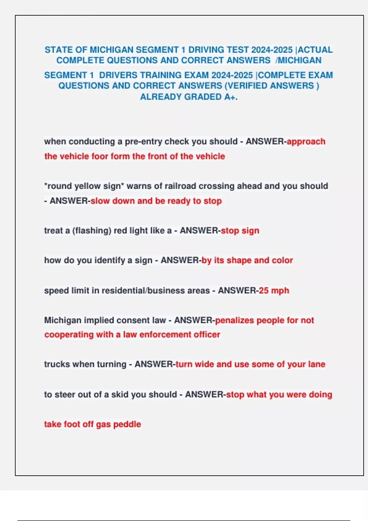 STATE OF MICHIGAN SEGMENT 1 DRIVING TEST |ACTUAL COMPLETE QUESTIONS AND CORRECT ANSWERS /MICHIGAN SEGMENT 1 DRIVERS TRAINING EXAM |COMPLETE EXAM QUESTIONS AND CORRECT ANSWERS (VERIFIED ANSWERS ) ALREADY GRADED A+. STATE OF MICHIGAN SEGMENT 1 DRIVING TEST |ACTUAL COMPLETE QUESTIONS AND CORRECT ANSWERS /MICHIGAN SEGMENT 1 DRIVERS TRAINING EXAM |COMPLETE EXAM QUESTIONS AND CORRECT ANSWERS (VERIFIED ANSWERS ) ALREADY GRADED A+. STATE OF MICHIGAN SEGMENT 1 DRIVING TEST |ACTUAL COMPLETE QUESTIONS AND CORRECT ANSWERS /MICHIGAN SEGMENT 1 DRIVERS TRAINING EXAM |COMPLETE EXAM QUESTIONS AND CORRECT ANSWERS (VERIFIED ANSWERS ) ALREADY GRADED A+. STATE OF MICHIGAN SEGMENT 1 DRIVING TEST |ACTUAL COMPLETE QUESTIONS AND CORRECT ANSWERS /MICHIGAN SEGMENT 1 DRIVERS TRAINING EXAM |COMPLETE EXAM QUESTIONS AND CORRECT ANSWERS (VERIFIED ANSWERS ) ALREADY GRADED A+.