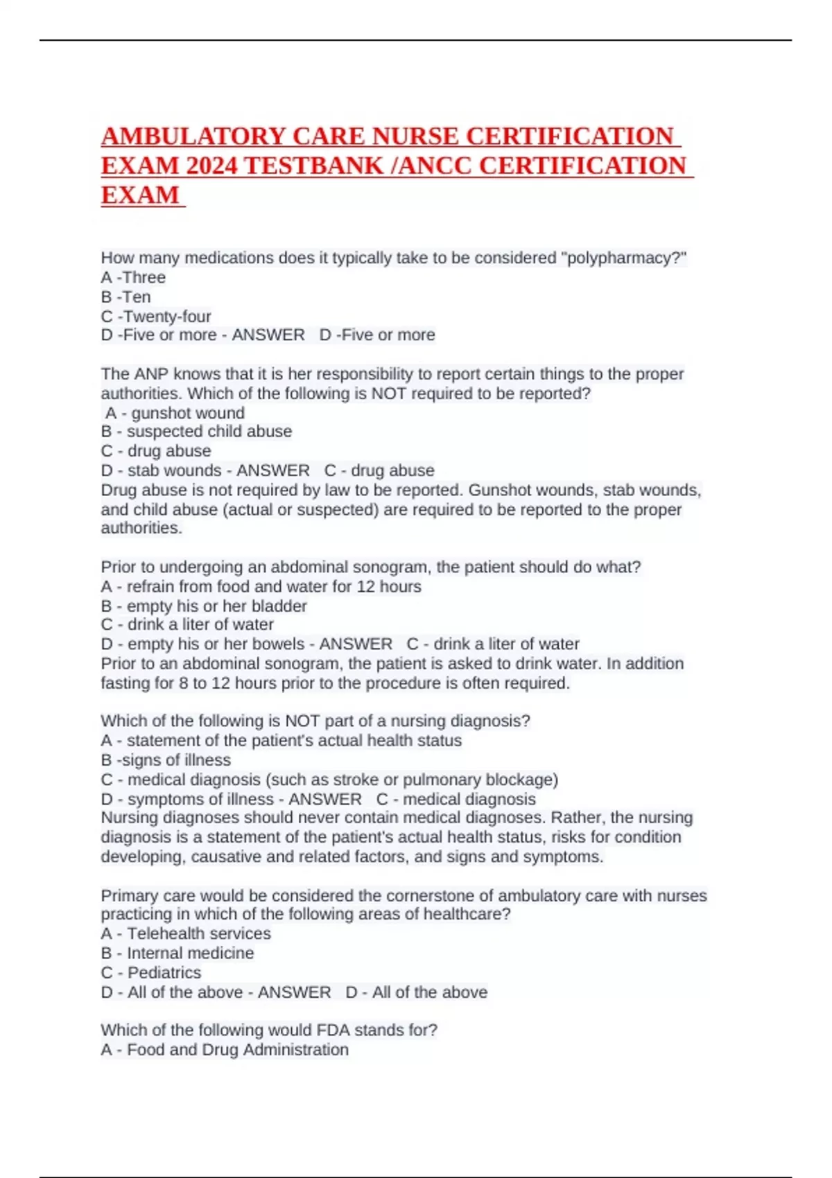 AMBULATORY CARE NURSE CERTIFICATION EXAM 2024 TESTBANK