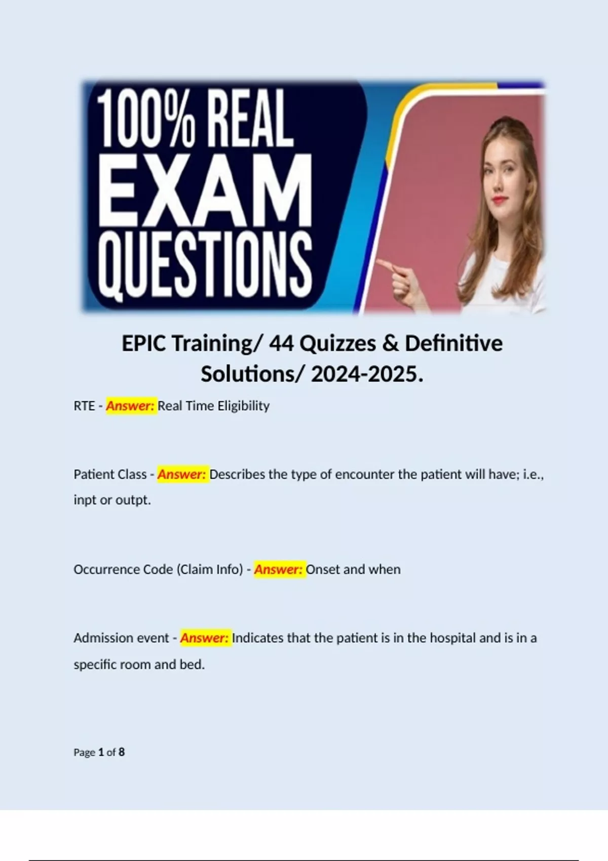 EPIC Training/ 44 Quizzes & Definitive Solutions/ . Terms like: RTE - Answer: Real Time Eligibility Patient Class - Answer: Describes the type of encounter the patient will have; i.e., inpt or outpt. Occurrence Code (Claim Info) - Answer: Onset and when