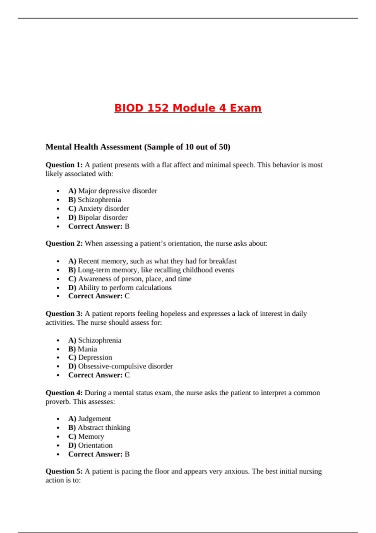Question 4: During a mental status exam, the nurse asks the patient to interpret a common