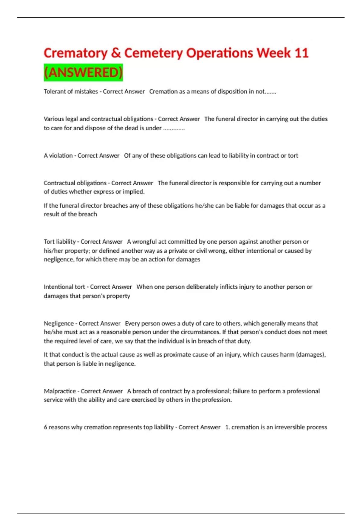 Tolerant of mistakes - Correct Answer Cremation as a means of disposition in not.......