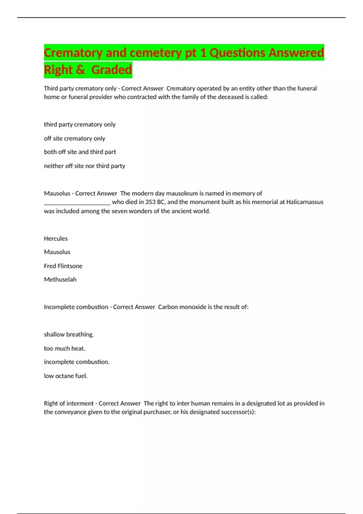 Right of interment - Correct Answer The right to inter human remains in a designated lot as provided in