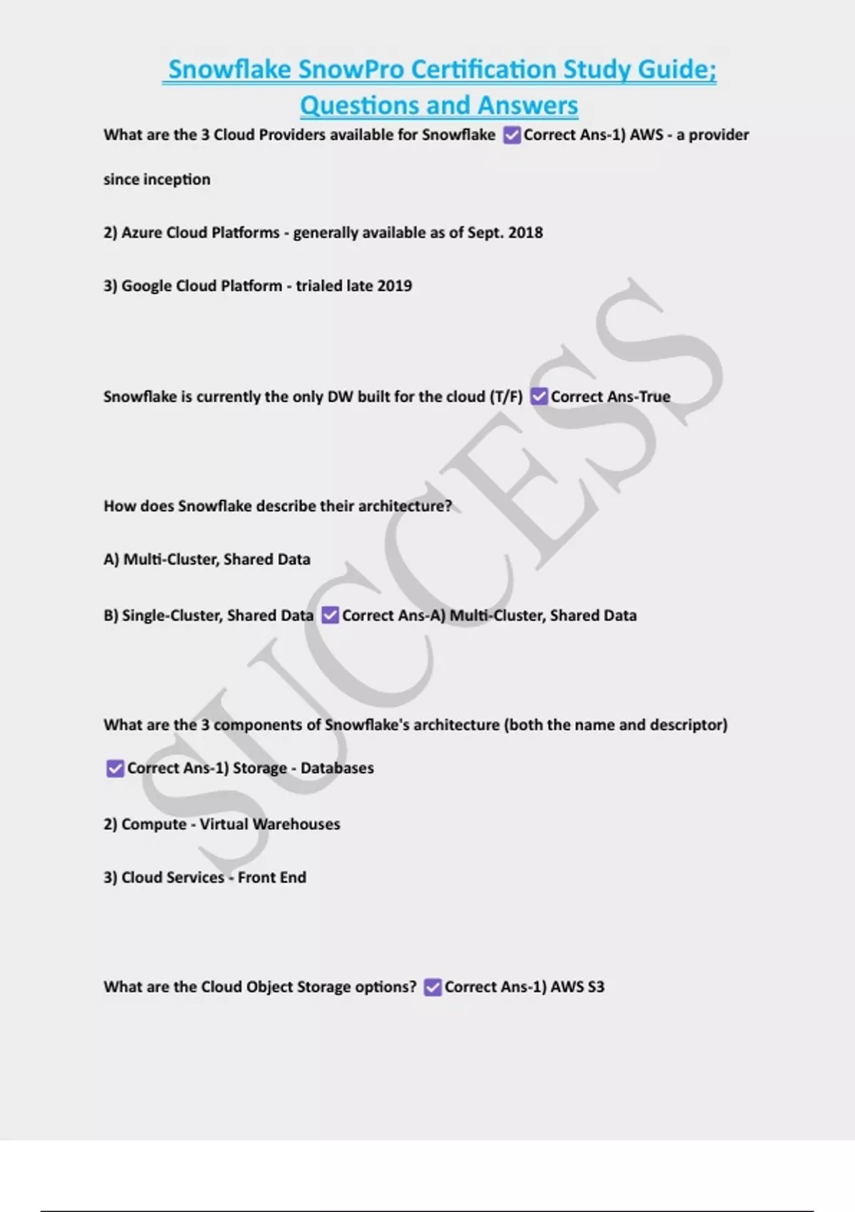 Snowflake SnowPro Certification Study Guide; Questions and Answers