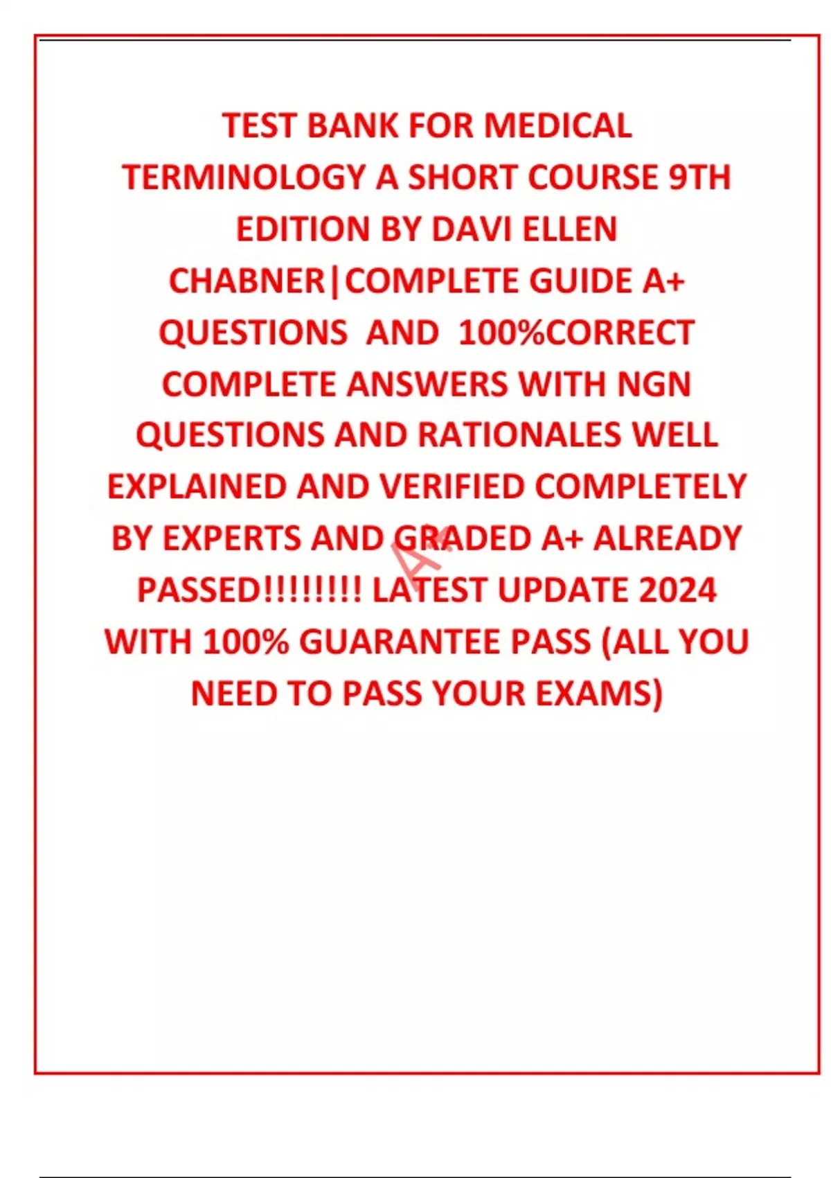 TEST BANK FOR MEDICAL TERMINOLOGY A SHORT COURSE 9TH EDITION BY DAVI ELLEN CHABNER|COMPLETE GUIDE A+ QUESTIONS AND 100%CORRECT COMPLETE ANSWERS WITH NGN QUESTIONS AND RATIONALES WELL EXPLAINED AND VERIFIED COMPLETELY BY EXPERTS AND GRADED A+ ALREADY PA