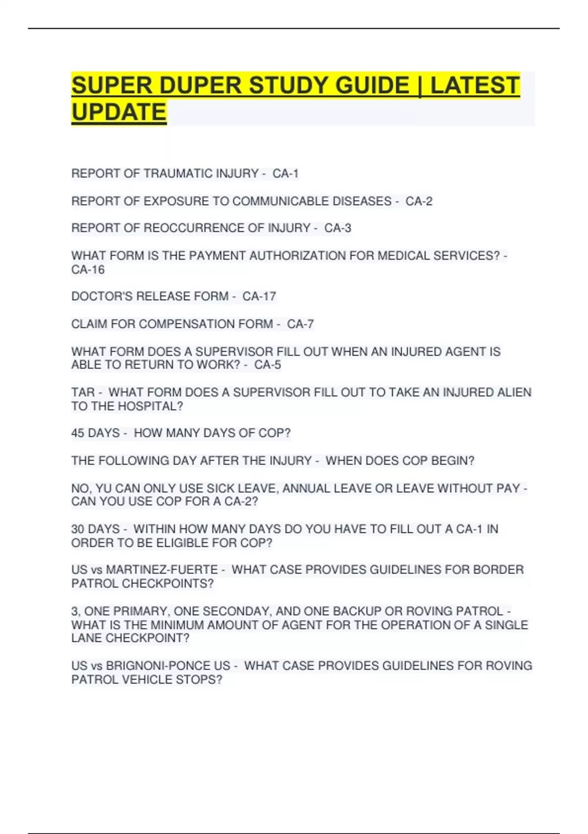 SUPER DUPER STUDY GUIDE | LATEST UPDATE REPORT OF TRAUMATIC INJURY - CA-1 REPORT OF EXPOSURE TO COMMUNICABLE DISEASES - CA-2 REPORT OF REOCCURRENCE OF INJURY - CA-3 WHAT FORM IS THE PAYMENT AUTHORIZATION FOR MEDICAL SERVICES? - CA-16 DOCTOR'S RELEASE FORM - CA-17 CLAIM FOR COMPENSATION FORM - CA-7 WHAT FORM DOES A SUPERVISOR FILL OUT WHEN AN INJURED AGENT IS ABLE TO RETURN TO WORK? - CA-5