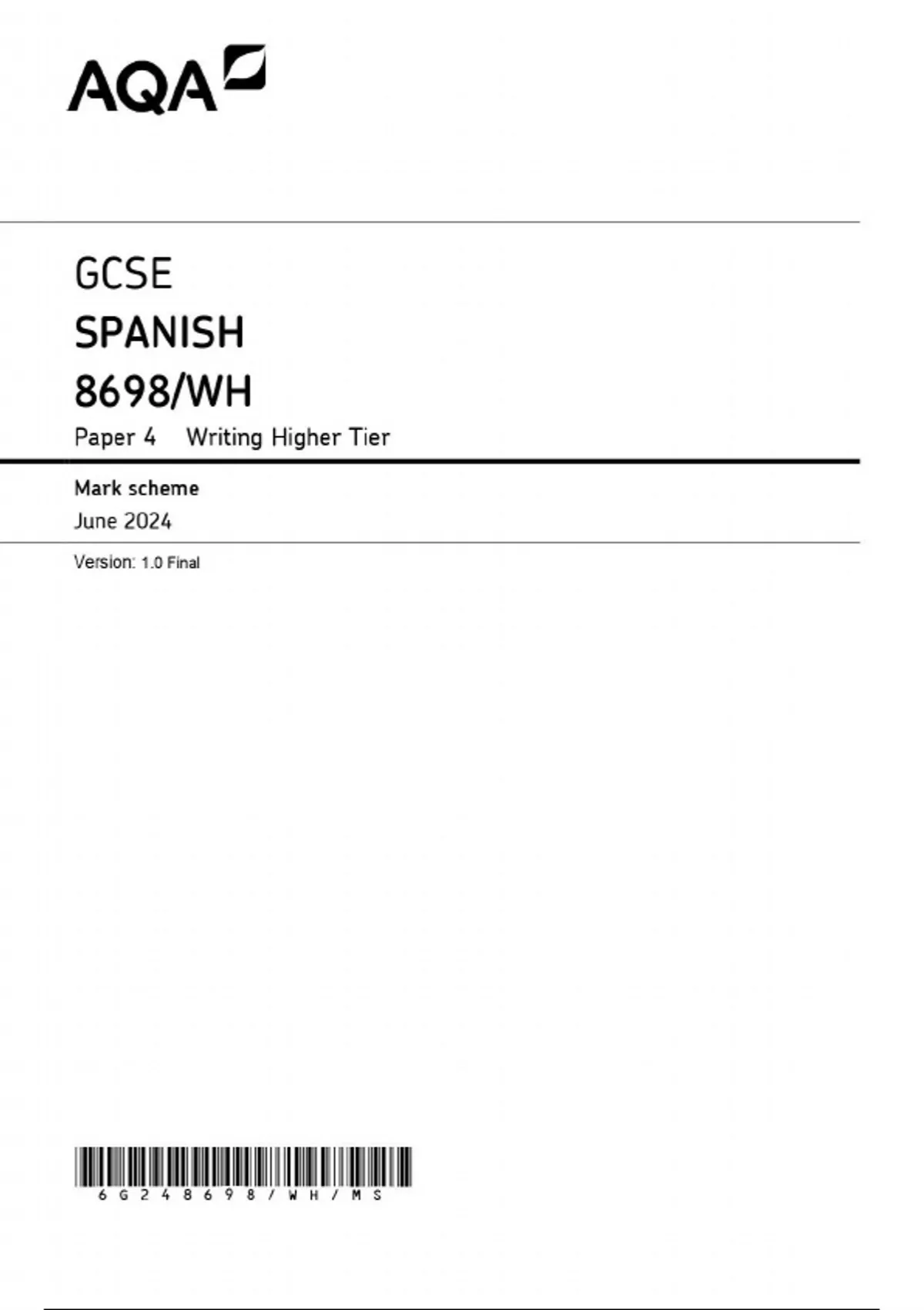 GCSE AQA June 2024 Higher Spanish Paper 4 Writing Mark Scheme