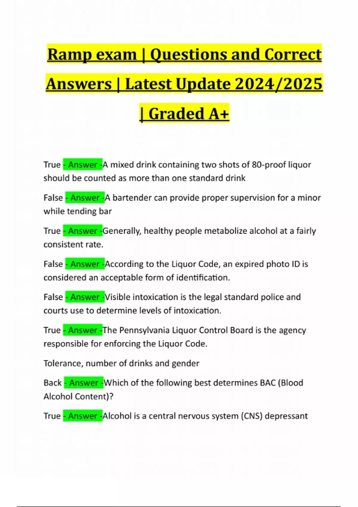 Ramp exam | Questions and Correct Answers | Latest Update 2024/2025 | Graded A+ True - Answer -A mixed drink containing two shots of 80-proof liquor should be counted as more than one standard drink False - Answer -A bartender can provide proper supervision for a minor while tending bar True - Answer -Generally, healthy people metabolize alcohol at a fairly consistent rate. False - Answer -According to the Liquor Code, an expired photo ID is considered an acceptable form of id