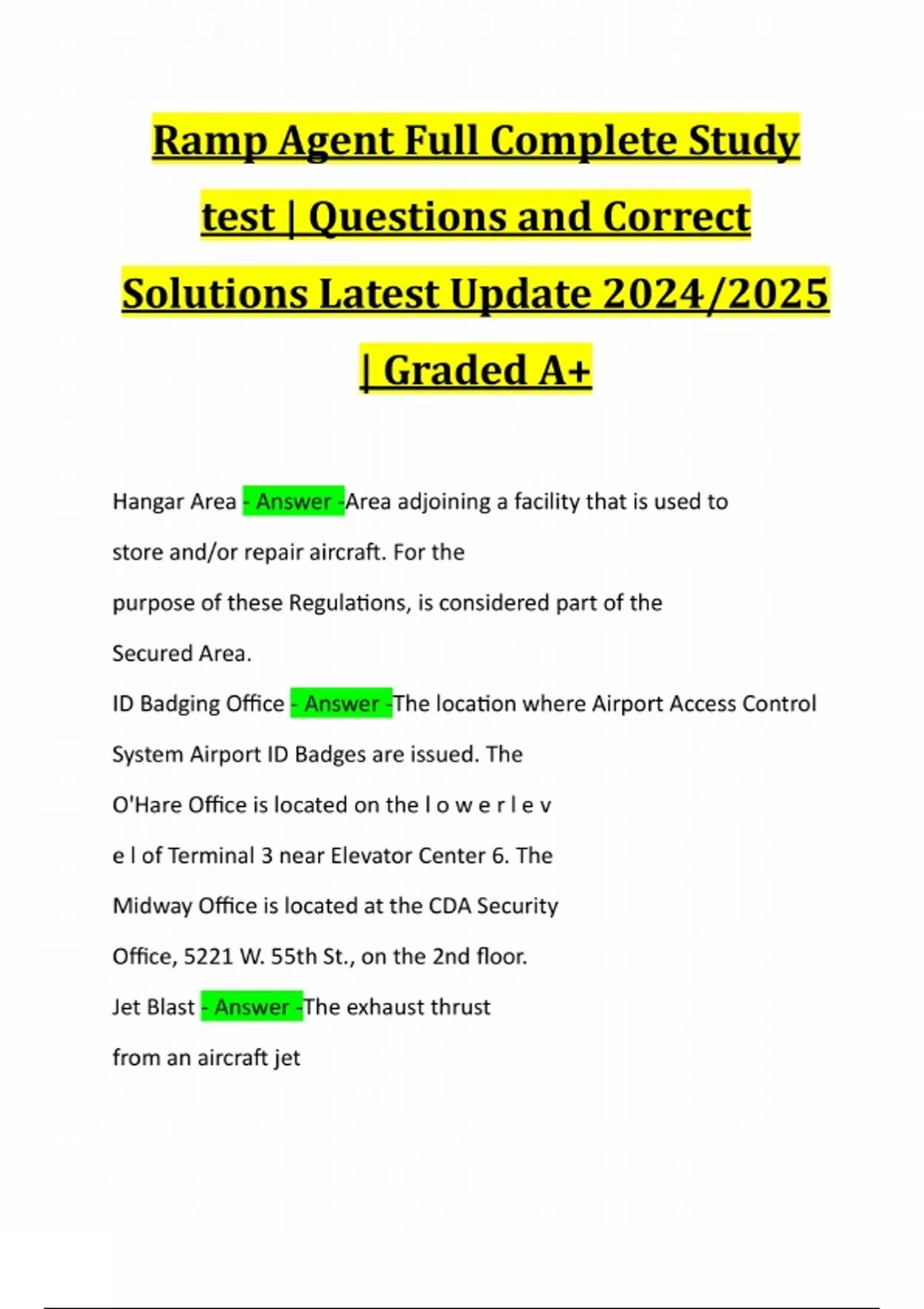Ramp Agent Full Complete Study test | Questions and Correct Solutions Latest Update 2024/2025 | Graded A+ Hangar Area - Answer -Area adjoining a facility that is used to store and/or repair aircraft. For the purpose of these Regulations, is considered part of the Secured Area. ID Badging Office - Answer -The location where Airport Access Control System Airport ID Badges are issued. The O'Hare Office is located on the l o w e r l e v e l of Terminal 3 near Elevator Center 6. The Midway Office is located at the CDA Security Office, 5221 W. 55th St., on the 2nd floor. Jet Blast - Answer -The exhaust thrust from an aircraft jetengine. Landside - Answer -That portion of the airport to which passengers and the non-traveling public have unrestricted access. Law Enforcement Officer - Answer -This includes, but is not limited to, any Chicago Police Officer or Aviation Security Offi