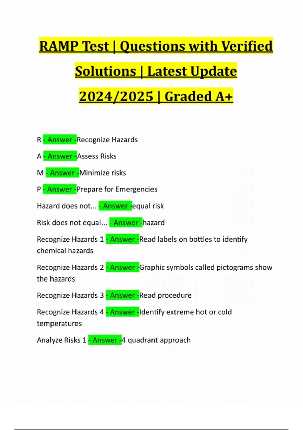 RAMP Test | Questions with Verified Solutions | Latest Update 2024/2025 | Graded A+ R - Answer -Recognize Hazards A - Answer -Assess Risks M - Answer -Minimize risks P - Answer -Prepare for Emergencies Hazard does not... - Answer -equal risk Risk does not equal... - Answer -hazard