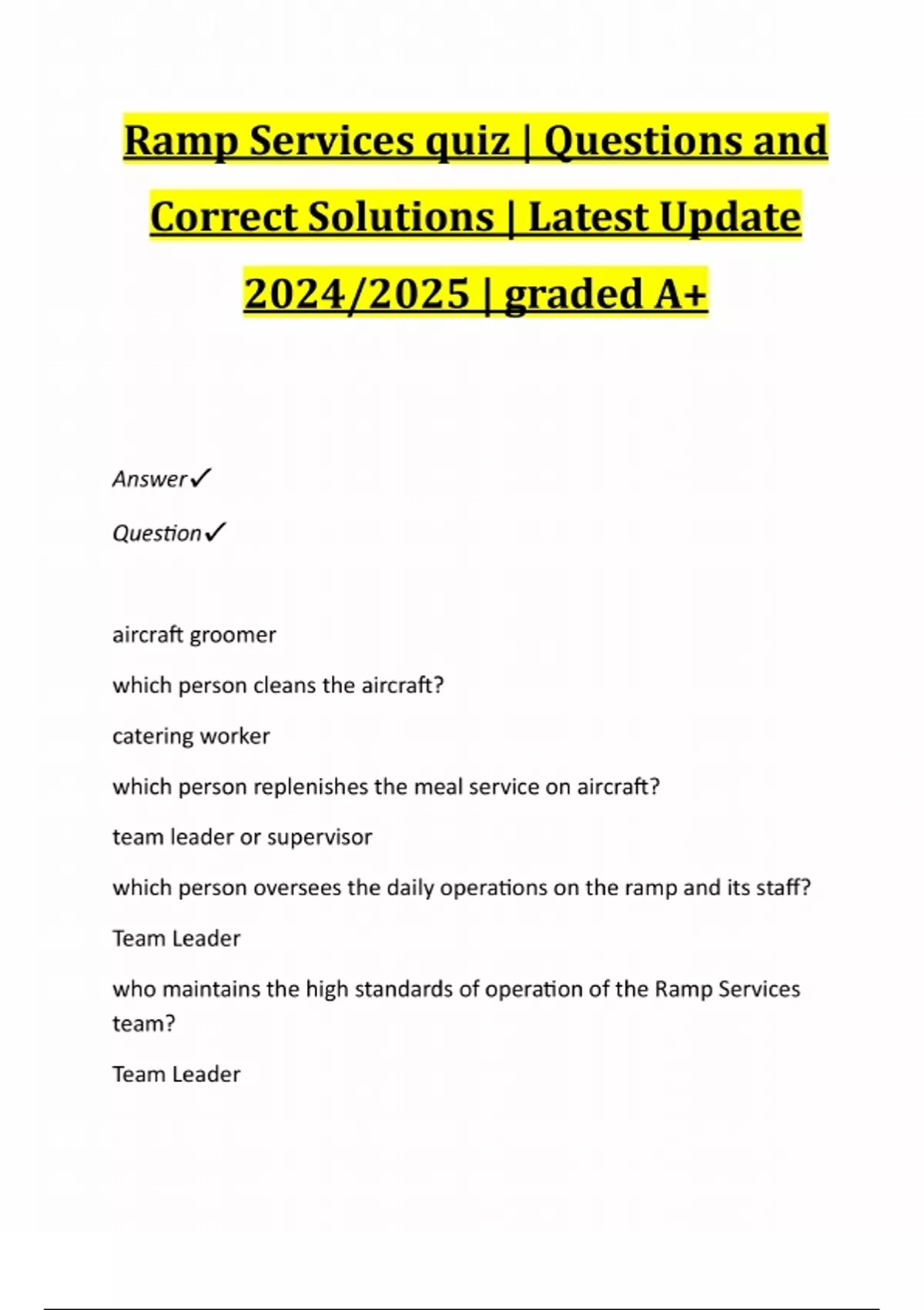 Ramp Services quiz | Questions and Correct Solutions | Latest Update 2024/2025 | graded A+ Answer Question aircraft groomer which person cleans the aircraft? catering worker which person replenishes the meal service on aircraft? team leader or supervisor which person oversees the daily operations on the ramp and its staff? Team Leader who maintains the high standards of operation of the Ramp Services team? Team Leaderwho ensures the maintenance of ramp equipment and terminal facilities? Team Leader who assists in the selection, training, development and performance of ramp services team members? aircraft movements team who guides aircraft into place, making sure they are correctly positioned on their stands? aircraft movements team who provides power to an aircraft electrical and air conditioning systems prior to departure? aircraft movements team who supports the Captain o