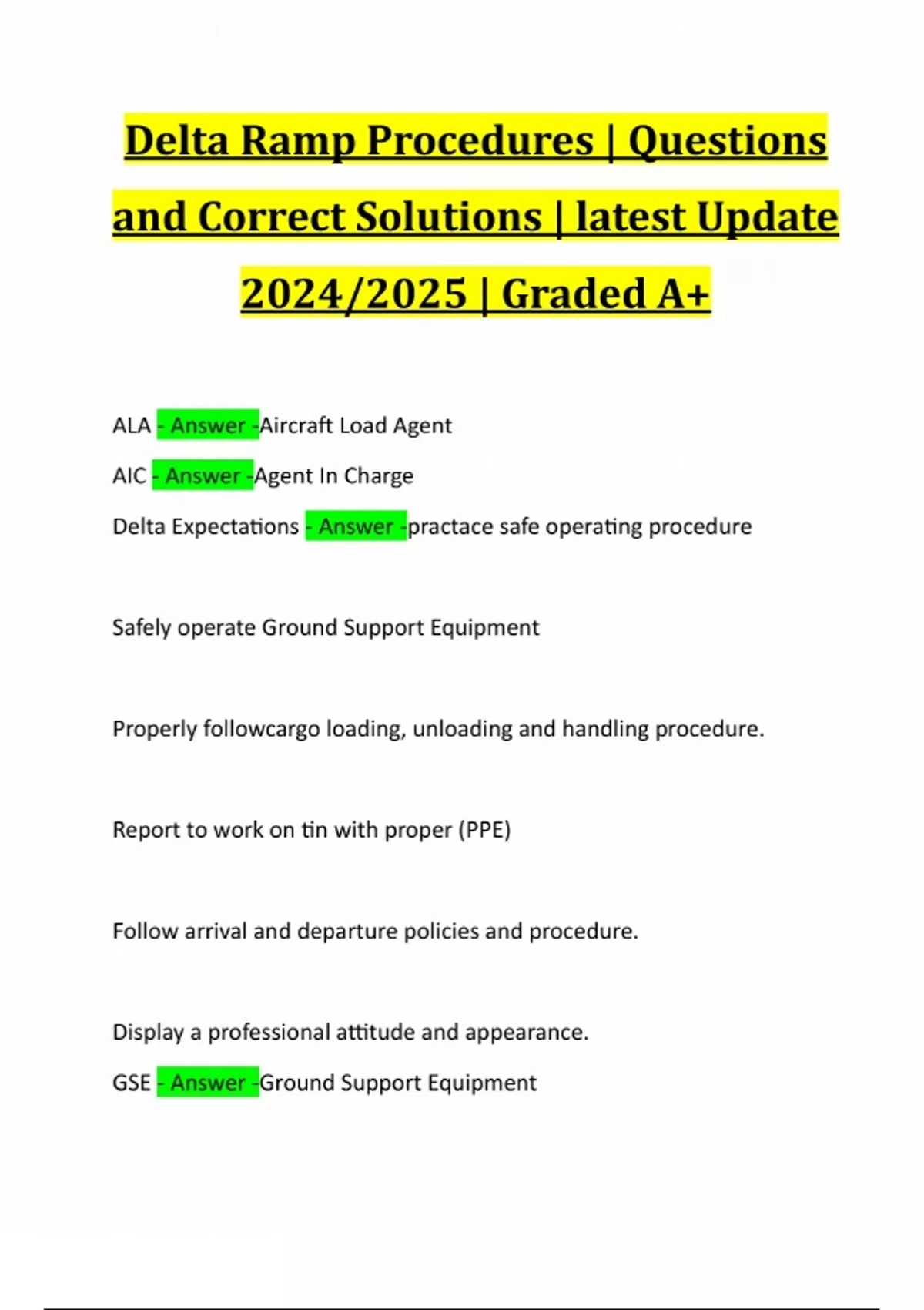 Delta Ramp Procedures | Questions and Correct Solutions | latest Update 2024/2025 | Graded A+ ALA - Answer -Aircraft Load Agent AIC - Answer -Agent In Charge Delta Expectations - Answer -practace safe operating procedure Safely operate Ground Support Equipment Properly followcargo loading, unloading and handling procedure. Report to work on tin with proper (PPE) Follow arrival and departure policies and procedure. Display a professional attitude and appearance. GSE - Answer -Ground Support EquipmentGOM - Answer -Ground Operation Manual SPPM - Answer -Safety Policy and Procedure Manual Delta HUB Cities - Answer -Atlanta (ATL) Seattle (SEA) Detroit (DTW)
