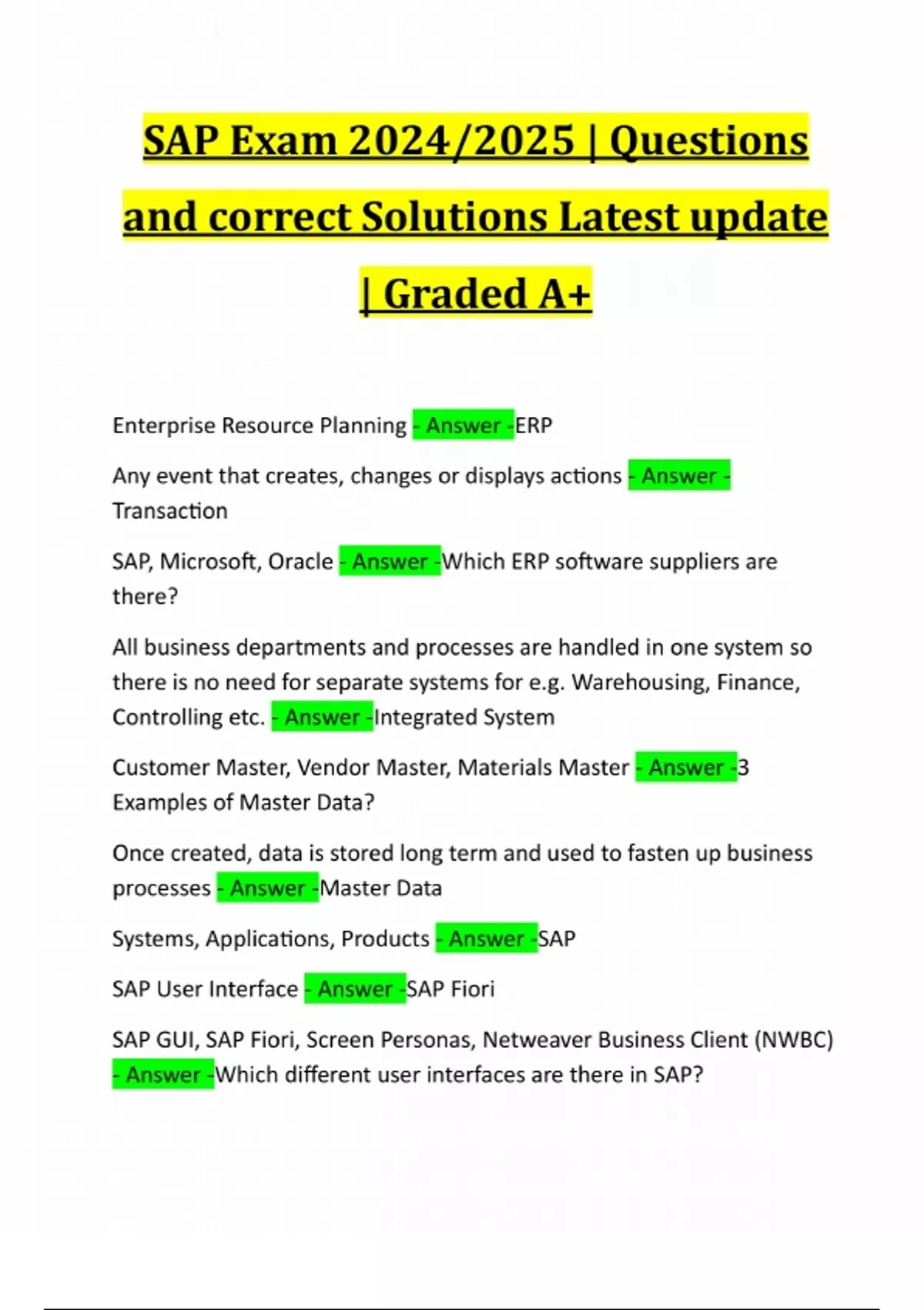 SAP Exam 2024/2025 | Questions and correct Solutions Latest update | Graded A+ Enterprise Resource Planning - Answer -ERP Any event that creates, changes or displays actions - Answer - Transaction SAP, Microsoft, Oracle - Answer -Which ERP software suppliers are there? All business departments and processes are handled in one system so there is no need for separate systems for e.g. Warehousing, Finance, Controlling etc. - Answer -Integrated System Customer Master, Vendor Master, Materials Master - Answer -3 Examples of Master Data? Once created, data is stored long term and used to fasten up business processes - Answer -Master Data Systems, Applications, Products - Answer -SAP SAP User Interface - Answer -SAP Fiori SAP GUI, SAP Fiori, Screen Personas, Netweaver Business Client (NWBC) - Answer -Which different user interfaces are there in SAP?Create shortcut for the most used transactions to the end-user - Answer -Purpose of the favourites folder? Adapting the system for company's business without programming, usually done by consultants - Answer -Configuration Configuration,User Exit/Badi/Enhancement,