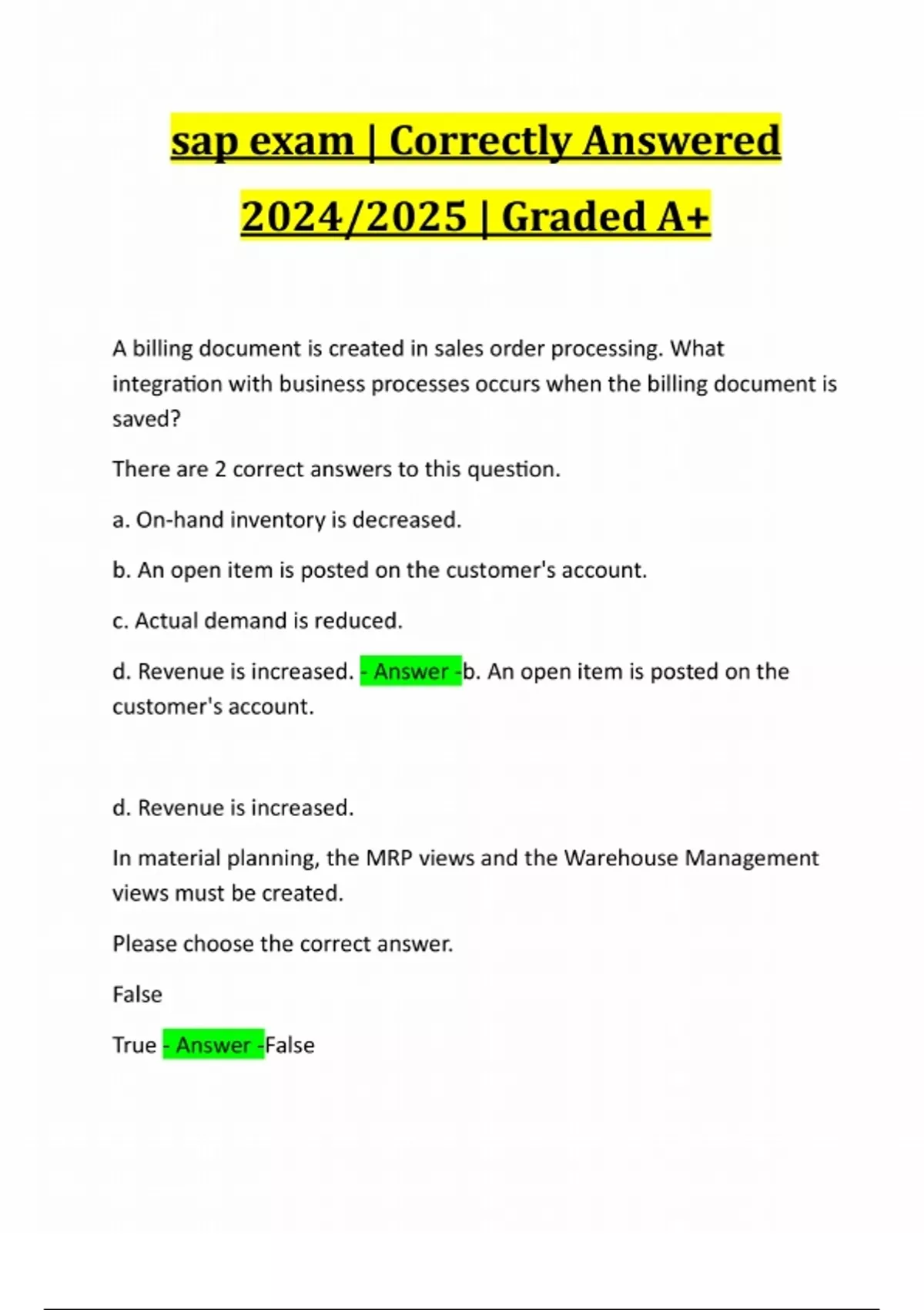 sap exam | Correctly Answered 2024/2025 | Graded A+ A billing document is created in sales order processing. What integration with business processes occurs when the billing document is saved? There are 2 correct answers to this question. a. On-hand inventory is decreased. b. An open item is posted on the customer's account. c. Actual demand is reduced. d. Revenue is increased. - Answer -b. An open item is posted on the customer's account. d. Revenue is increased. In material planning, the MRP views and the Warehouse Management views must be created. Please choose the correct answer. False True - Answer -FalseYour organization is implementing the SAP ERP Procurement Cycle, to improve operational efficiencies. Which of the following organizational levels are required to create a purchase order? There are 3 correct answers to this question. a. Purchasing organization b. Storage location c. Plant d. Purchasing group e. Vendor - Answer -a. Purchasing c. Plant d. Purchasing group Which of the following are used within the FI General Ledger? There are 3 correct answers to this question. a. CO-PA b. FI MM c. FI AR