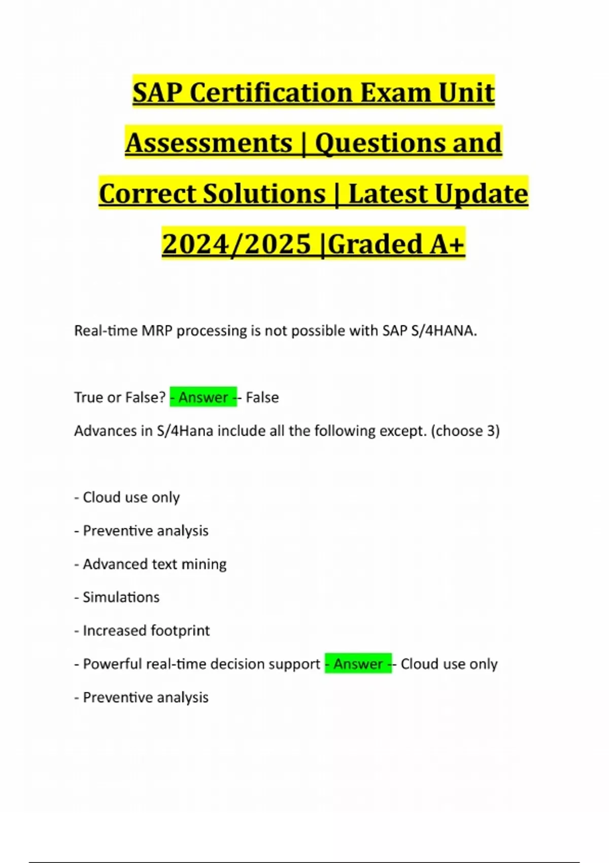 SAP Certification Exam Unit Assessments | Questions and Correct Solutions | Latest Update 2024/2025 |Graded A+ Real-time MRP processing is not possible with SAP S/4HANA. True or False? - Answer -- False Advances in S/4Hana include all the following except. (choose 3) - Cloud use only - Preventive analysis - Advanced text mining - Simulations - Increased footprint - Powerful real-time decision support - Answer -- Cloud use only - Preventive analysis- Increased footprint OLTP and OLAP are separate in SAP S/4 HANA. True or False? - Answer -- False SAP S/4HANA's new generation of the suite comprises a new: (choose 3) - User interface - SAP Fiori user experience (UX) - Guided configurations - Code base - Answer -- SAP Fiori use experience (UX) - Guided configurations - Code base Select those which represent facts about SAP S/4HANA (choose 4) - Built on SAP HANA - A 2x smaller data footprint - Unlimited work capacity - Multi-tenancy - Only deployed on the cloud- No locking, parallelism - Answer -- Built on SAP HAN