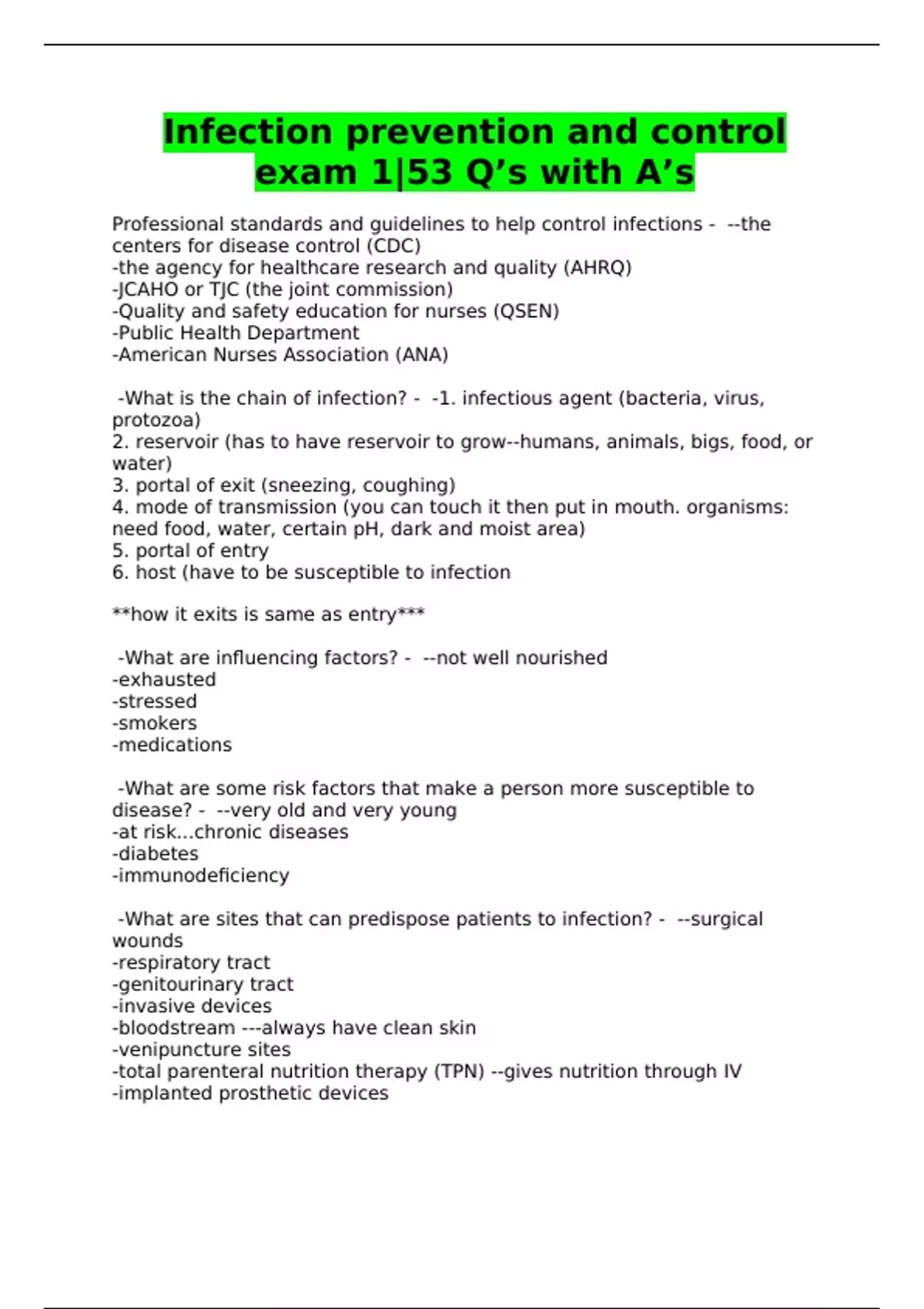Infection prevention and control exam 1|53 Q’s with A’s