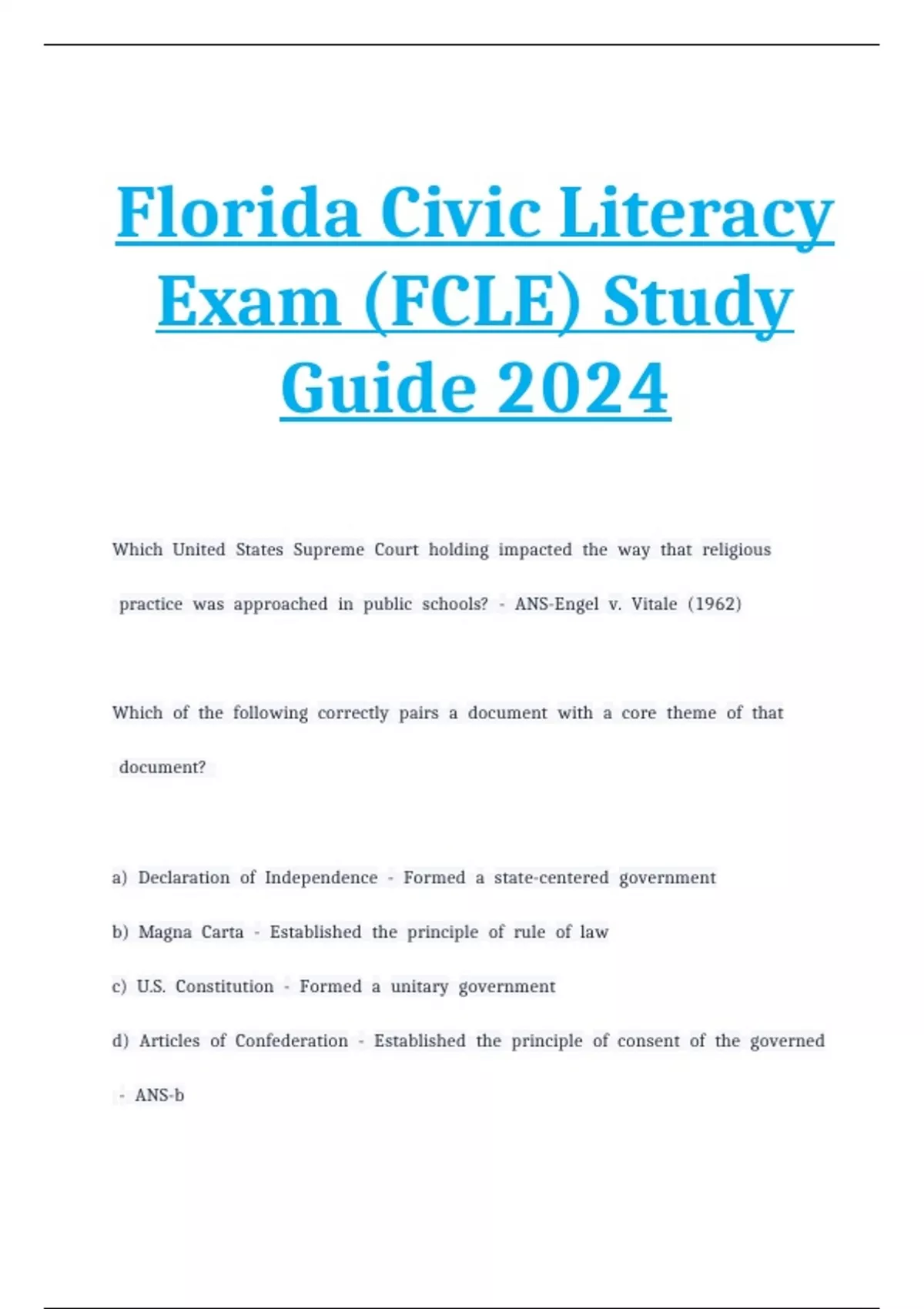 Florida Civic Literacy Exam (FCLE) Study Guide 2024.