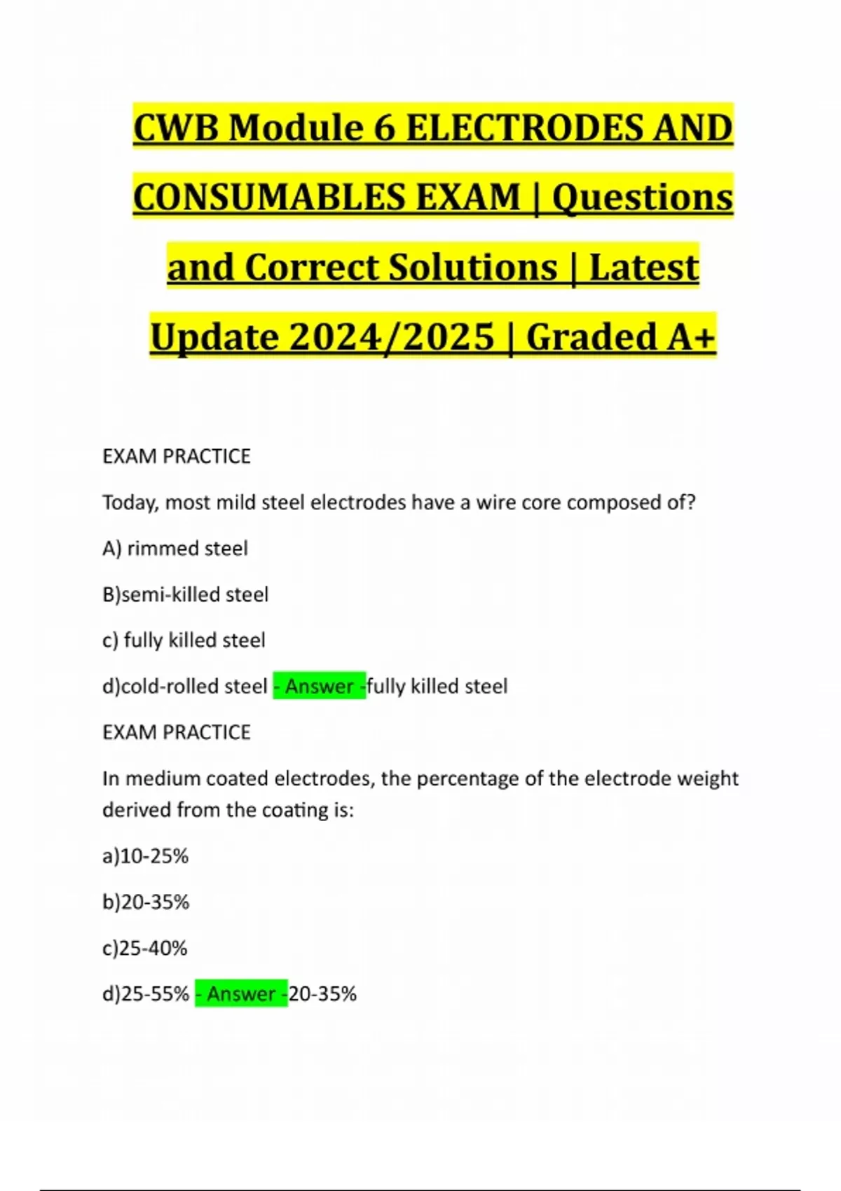 CWB Module 6 ELECTRODES AND CONSUMABLES EXAM | Questions and Correct Solutions | Latest Update 2024/2025 | Graded A+ EXAM PRACTICE Today, most mild steel electrodes have a wire core composed of? A) rimmed steel B)semi-killed steel c) fully killed steel d)cold-rolled steel - Answer -fully killed steel EXAM PRACTICE In medium coated electrodes, the percentage of the electrode weight derived from the coating is: a)10-25% b)20-35% c)25-40% d)25-55% - Answer -20-35%EXAM PRACTICE The main function of slag do not include: a)slowing the critical cooling rate of the weld b)protecting the weld metal from contamination c)reducing the amount of oxygen and other impurities in the weld d) controlling the bead shape and smoothness - Answer -a) slowing the critical cooling rate of the weld EXAM PRACTICE An electrode that is to be used