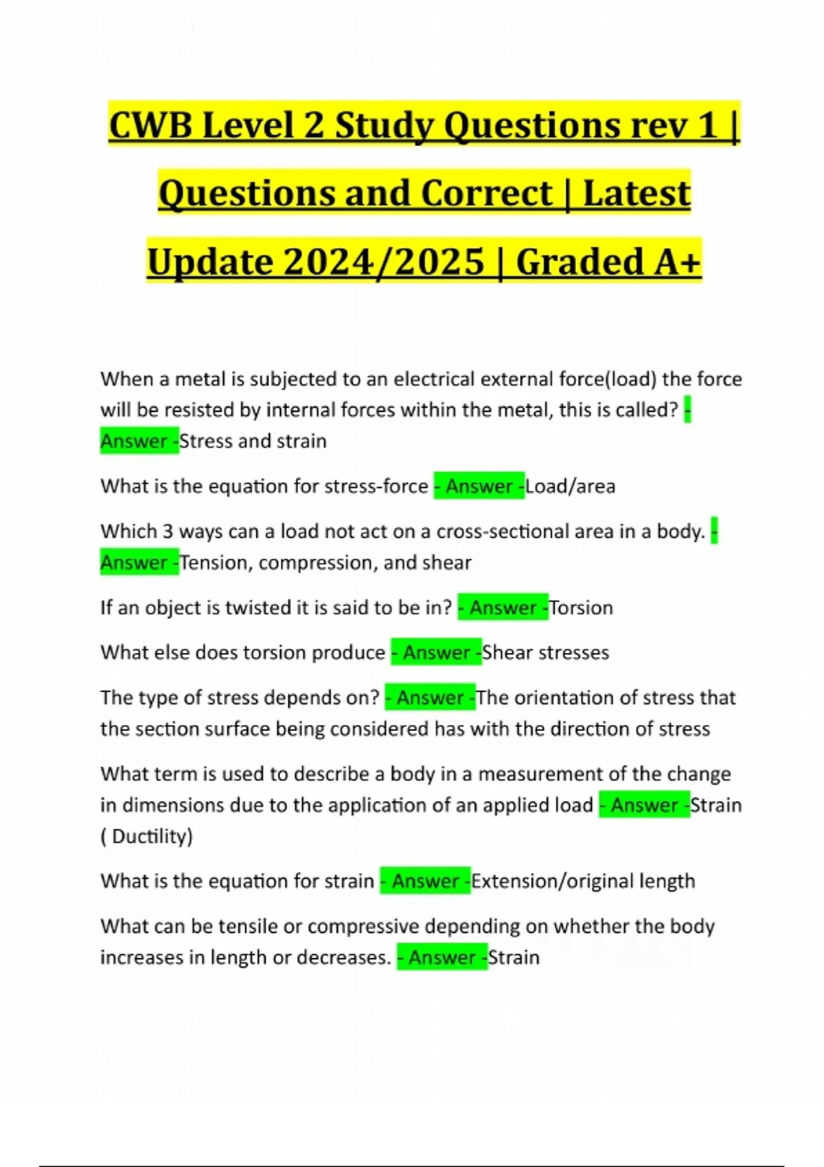 CWB Level 2 Study Questions rev 1 | Questions and Correct | Latest Update 2024/2025 | Graded A+ When a metal is subjected to an electrical external force(load) the force will be resisted by internal forces within the metal, this is called? - Answer -Stress and strain What is the equation for stress-force - Answer -Load/area Which 3 ways can a load not act on a cross-sectional area in a body. - Answer -Tension, compression, and shear If an object is twisted it is said to be in? - Answer -Torsion What else does torsion produce - Answer -Shear stresses The type of stress depends on? - Answer -The orientation of stress that the section surface being considered has with the direction of stress What term is used to describe a body in a measurement of the change in dimensions due to the application of an applied load - Answer -Strain ( Ductility) What is the equation for strain - Answer -Extension/original length What can be tensile or compressive depending on whether the body increases in length or decreases. - Answer -StrainWhat direction is affected in the stress and strain when a bar is loaded - Answer -Axial direction (along its length) When a specimen stretches it becomes thinner and suffers a strain in what direction - Answer -Transverse direction (across the thickness) Which type of stress occurs in only one direction but produces strains in other? Does this occur in thin or thick sections - Answer -Plane stress and it occurs in thin sections The relationship between E and the stress/strain is called what? - Answer -Hooke's law