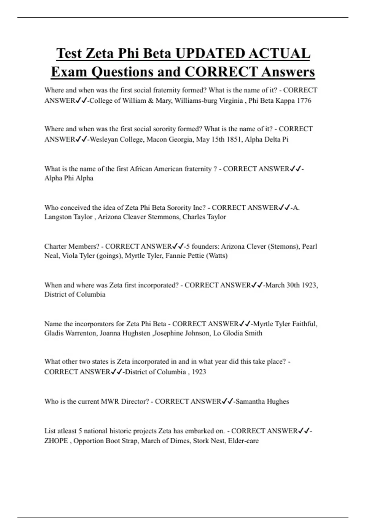 Test Zeta Phi Beta UPDATED ACTUAL Exam Questions and CORRECT Answers Where and when was the first social fraternity formed? What is the name of it? - CORRECT ANSWER-College of William & Mary, Williams-burg Virginia , Phi Beta Kappa 1776 Where and when was the first social sorority formed? What is the name of it? - CORRECT ANSWER-Wesleyan College, Macon Georgia, May 15th 1851, Alpha Delta Pi