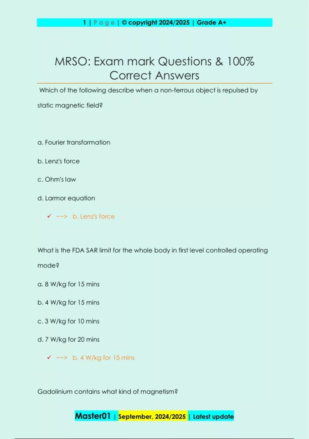 Which of the following describe when a non-ferrous object is repulsed by static magnetic field? a. Fourier transformation b. Lenz's force c. Ohm's law d. Larmor equation ~~> b. Lenz's force What is the FDA SAR limit for the whole body in first level controlled operating mode? a. 8 W/kg for 15 mins b. 4 W/kg for 15 mins c. 3 W/kg for 10 mins d. 7 W/kg for 20 mins ~~> b. 4 W/kg for 15 mins Gadolinium contains what kind of magnetism? 2 | P a g e | © copyright 2024/2025 | Grade A+ Master01 | September, 2024/2025 | Latest update a. Diamagnetic b. Paramagnetic c. Ferromagnetic d. Super paramagnetic ~~> b. Paramagnetic Where will peripheral nerve stimulation be the strongest? a. Further away from isocenter in the gantry b. At the level of the table when it is advanced c. At isocenter d. Outside the gantry near the 5 gauss line ~~> a. Further away from the isocenter in the gantry What is the name for the direction of the vector of the static magnetic field? a. Inverse field b. Equilibrium c. B0 d. B1 3 | P a g e | © copyright 2024/2025 | Grade A+ Master0