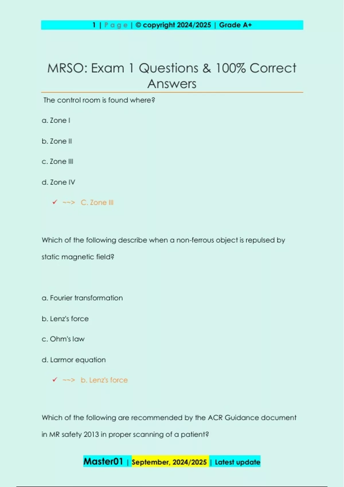 The control room is found where? a. Zone I b. Zone II c. Zone III d. Zone IV ~~> C. Zone III Which of the following describe when a non-ferrous object is repulsed by static magnetic field? a. Fourier transformation b. Lenz's force c. Ohm's law d. Larmor equation ~~> b. Lenz's force Which of the following are recommended by the ACR Guidance document in MR safety 2013 in proper scanning of a patient? 2 | P a g e | © copyright 2024/2025 | Grade A+ Master01 | September, 2024/2025 | Latest update I. Metal detector II. Ferromagnetic detection system III. Written screening sheet IV. Patient gown a. I, III, IV b. I, II, III, IV c. II, III, IV d. III ~~> c. II, III, IV What is the FDA SAR limit for the whole body in first level controlled operating mode? a. 8 W/kg for 15 mins b. 4 W/kg for 15 mins c. 3 W/kg for 10 mins d. 7 W/kg for 20 mins ~~> b. 4 W/kg for 15 mins Gadolinium contains what kind of magnetism? 3 | P a g e | © copyright 2024/2025 | Grade A+ Master01 | September, 2024/2025 | Latest update a. Diamagnetic b. Paramagnetic c. Ferromagnetic d. Super paramagnetic ~~> b. Paramagnetic Which of the following is true of Zone IV? Select all that apply. a. This area should be monitored by a level 2 MR personnel b. Should be noted with signage c. Contain metal detectors for implant identification d. No unsafe implants may cross the 5-gauss unless the implant is researched and analyzed for risk ~~> a, b, d Where will peripheral nerve stimulation be the strongest? a. Further away from isocenter in the gantry b. At the level of the table when it is advanced c. At isocenter d. Outside the gantry near the 5 gauss line 4 | P a g e | © copyright 2024/2025 | Grade A+ Master01 | September, 2024/2025 | Latest update ~~> a. Further away from th