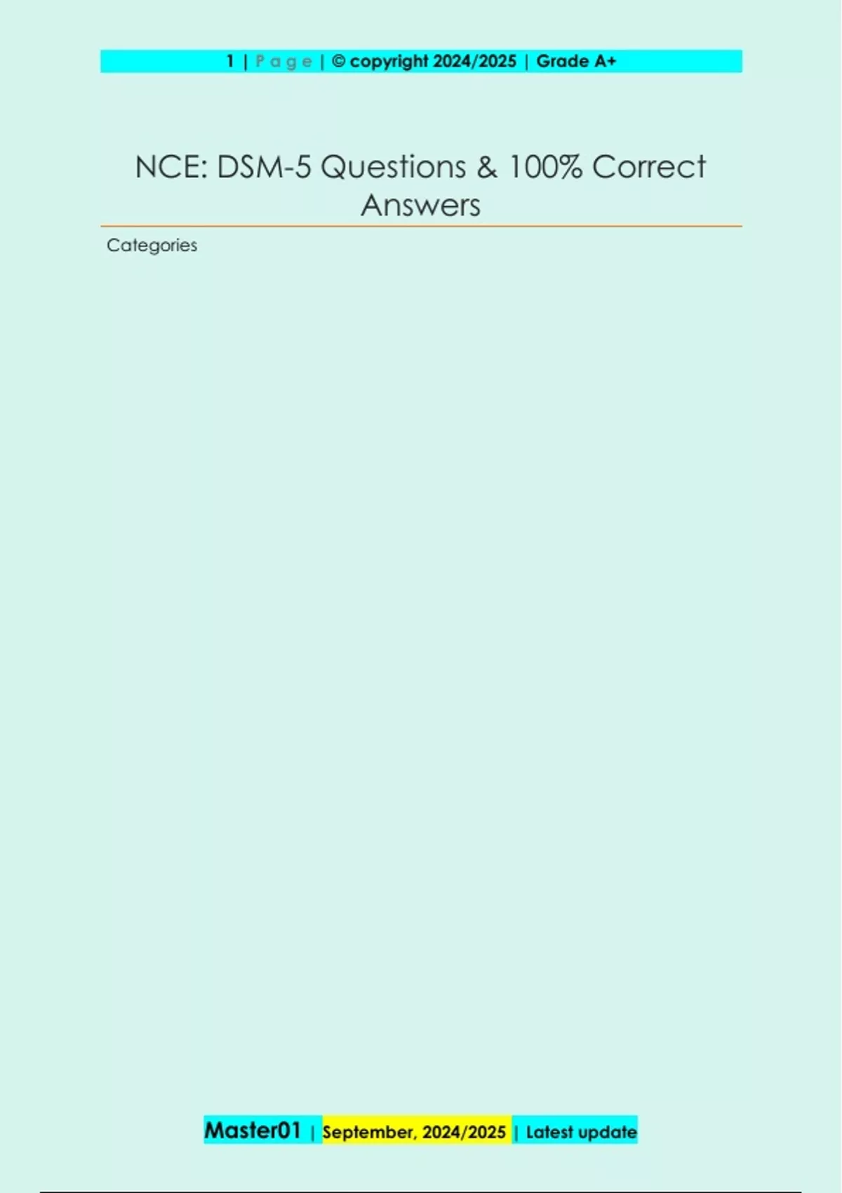 Categories 2 | P a g e | © copyright 2024/2025 | Grade A+ Master01 | September, 2024/2025 | Latest update ~~> Neurodevelopmental Disorders Schizophrenia and Other Psychotic Disorders Bipolar Depressive Anxiety OCD Trauma and Stress Dissociative Somatic Feeding & Eating Sleep Wake Sexual Gender Dysforia Disruptive, Impulse Control, Conduct Substance Related and Addictive Neurocognitive Paraphilic Single Axis 3 | P a g e | © copyright 2024/2025 | Grade A+ Master01 | September, 2024/2025 | Latest update ~~> Axis 1-3 combined into 1 with all psychological and medical conditions listed together. Then, list V codes for psychosocial and environmental contributing factors. Then list WHO Disability Assessment Schedule for disability (replaces GAF). ICD-9-CM ~~> Published by WHO. Contains medical code number needed for insurance companies. Intellectual Disability ~~> New name for Mental Retardation 1. IQ of 70 or below on individually administered test. 2. Impairments in adaptive functioning in +2 areas 3. Onset before 18. Specific Learning Disorder ~~> Individual's achievement on standardized tests of reading, math, or written expression are below that expected for age, schooling, and intelligence level. Autism Spectrum Disorder 4 | P a g e | © copyright 2024/2025 | Grade A+ Master01 | September, 2024/2025 | Latest update ~~> Combines Autism, Aspergers, Pervasive Developmental Disorder, and Childhood Disintegrative Disorder. 1. Impairment in social interaction in +2 areas (no nonverbals, no social interactions) 2. Impairment in communication (no speech, repetitive speech) 3. Restricted repetitive stereotyped patterns of behavior AD/HD ~~> Type: Combined, Inattentive, or Hyperactive-Impulsive 1. +6 symptoms of inattention or hyperactivity. 2. Onset before age 12. Conduct Disorder ~~> Persistent pattern of behavior in which the basic rights of others or societal norms are violated. 1. Aggression to people and animals; Destruction of Property, Deceitfulness or Theft; Serious violation of rules Oppositional Defiant Disorder ~~> Pattern of negative, hostile, and defiant emotions and behavior. 1. Angry/irritable, argumentative/defiant, vindictive categories of criteria. 5 | P a g e | © copyright 2024/2025 | Grade A+ Master01 | September, 2024/2025 | Latest update Substance Use Disoder ~~> Combines criteria for substance abuse and dependence. 1. Tolerance 2. Withdrawal 3. Substance use in large amounts 4. Continued use despite physical hazards, legal problems, social or interpersonal problems Separate criteria for sub