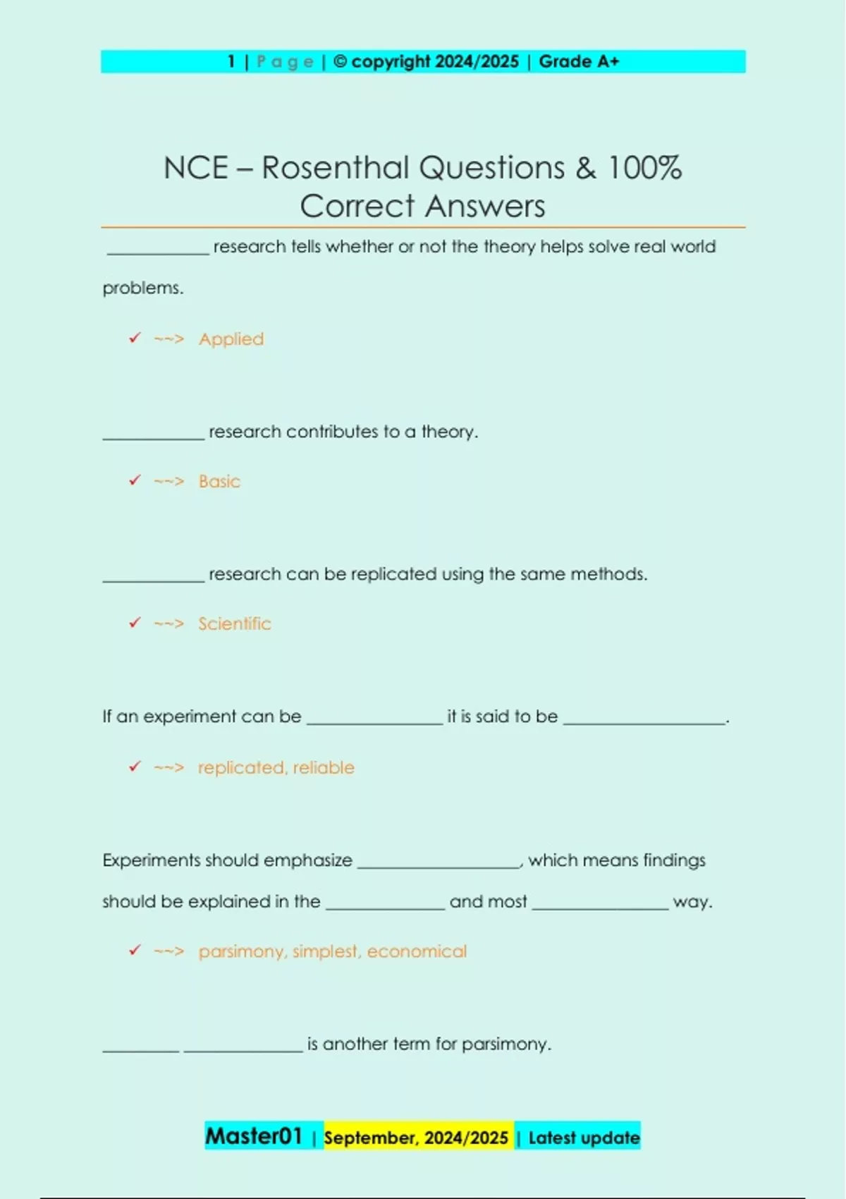 __________ research tells whether or not the theory helps solve real world problems. ~~> Applied ____________ research contributes to a theory. ~~> Basic ____________ research can be replicated using the same methods. ~~> Scientific If an experiment can be ________________ it is said to be ___________________. ~~> replicated, reliable Experiments should emphasize ___________________, which means findings should be explained in the ______________ and most ________________ way. ~~> parsimony, simplest, economical _________ ______________ is another term for parsimony. 2 | P a g e | © copyright 2024/2025 | Grade A+ Master01 | September, 2024/2025 | Latest update ~~> Occam's Razor The most common type of research is known a the _____________ or the so called true _____________. ~~> experiment, experiment ________________ is keeping out undesirable variables. ~~> Confounding The ____________ ___________ is the variable the experimenter manipulates. ~~> Independent variable The ____________ ___________ is the result/data. ~~> Dependent variable If a relationship exists, then the ____________ ___________ is somewhat dependent on the ____________ ___________. ~~> dependent variable, independent variable The group that does not receive the independent variable is known as the _________________ group. 3 | P a g e | © copyright 2024/2025 | Grade A+ Master01 | September, 2024/2025 | Latest update ~~> control The group that does receive the independent variable is known as the _______________________ group. ~~> experimental What is the impact of the _____________________ on the ________________________? ~~> independent variable, dependent variable The process of ___________________ ____________________ is used to assign subjects to the control group and the experimental group. ~~> random sampling Random sampling keeps the researcher ___________________. ~~> honest _________-__________________ research fails to use random assignments and lacks a control group. ~~> Quasi-experimenta