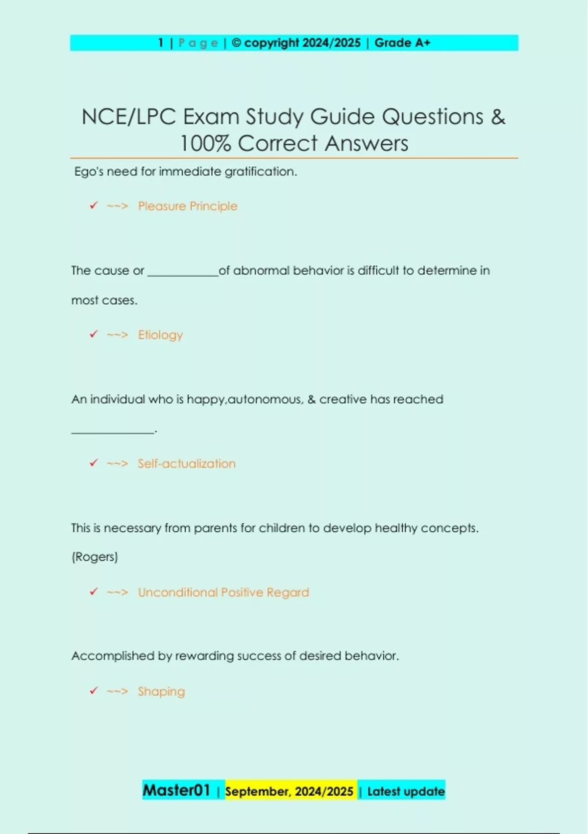 Ego's need for immediate gratification. ~~> Pleasure Principle The cause or ____________of abnormal behavior is difficult to determine in most cases. ~~> Etiology An individual who is happy,autonomous, & creative has reached ______________. ~~> Self-actualization This is necessary from parents for children to develop healthy concepts. (Rogers) ~~> Unconditional Positive Regard Accomplished by rewarding success of desired behavior. ~~> Shaping 2 | P a g e | © copyright 2024/2025 | Grade A+ Master01 | September, 2024/2025 | Latest update Learning method involving the conditioning of new stimuli to existing responses. ~~> Classical Conditioning A behavior modification used to establish new behavior. ~~> reinforcement The designations "common," "personal," & "cardinal" refer to ______________. ~~> Trait Theory Individuals are in an interactional relationship with their environment. ~~> contextual worldview Freud believed human behavior is mainly motivated by the psychosexual energy called __________. ~~> libido Relearning by using a particular stimulus to establish a new, more adaptive response ~~> counter conditioning 3 | P a g e | © copyright 2024/2025 | Grade A+ Master01 | September, 2024/2025 | Latest update Idea that there are many different ways to interpret events, each one leading to different behaviors. ~~> Kelly's concept of Constructive Alternativism A severe psychological disorder involving loss of contact with reality. ~~> Psychosis Process of development and body change resulting from heredity rather than learning. ~~> Maturation Vicarious conditioning occurs through observed________. ~~> mod
