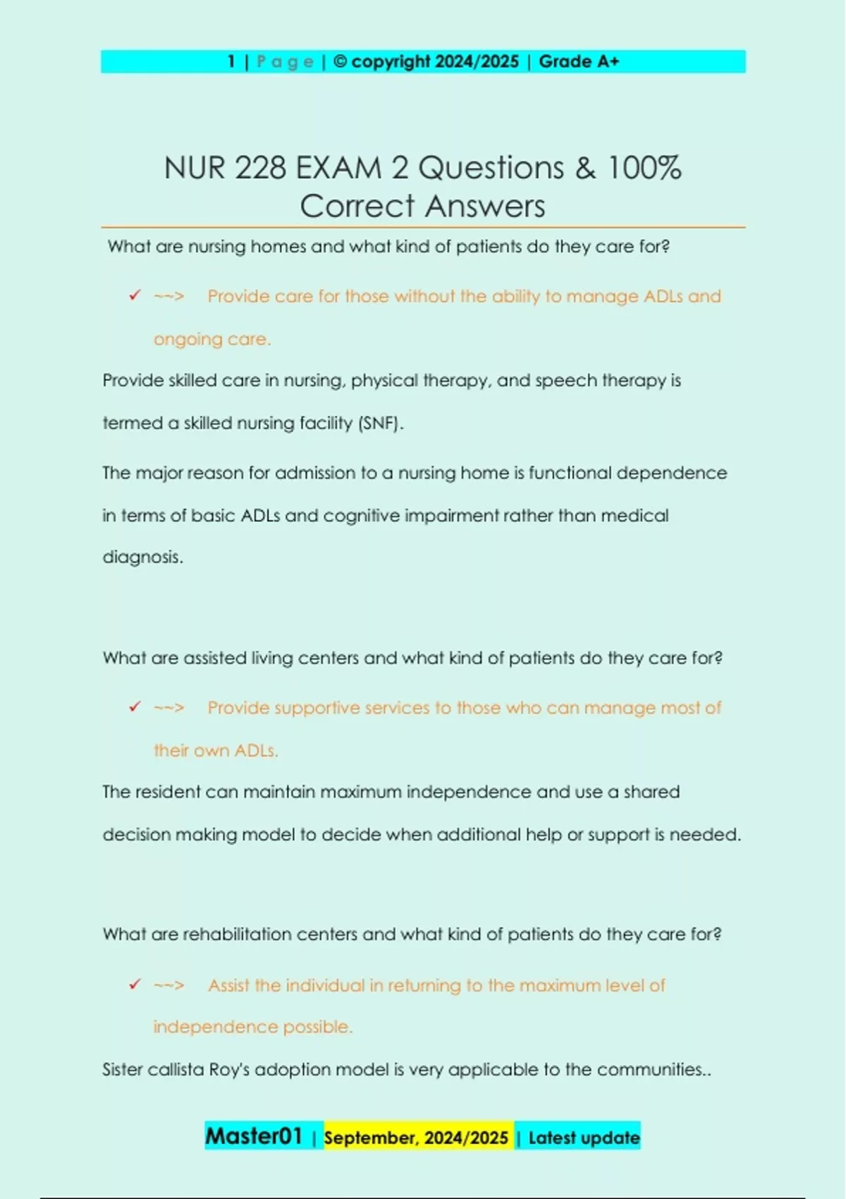 What are nursing homes and what kind of patients do they care for? ~~> Provide care for those without the ability to manage ADLs and ongoing care. Provide skilled care in nursing, physical therapy, and speech therapy is termed a skilled nursing facility (SNF). The major reason for admission to a nursing home is functional dependence in terms of basic ADLs and cognitive impairment rather than medical diagnosis. What are assisted living centers and what kind of patients do they care for? ~~> Provide supportive services to those who can manage most of their own ADLs. The resident can maintain maximum independence and use a shared decision making model to decide when additional help or support is needed. What are rehabilitation centers and what kind of patients do they care for? ~~> Assist the individual in returning to the maximum level of independence possible. Sister callista Roy's adoption model is very applicable to the communities.. 2 | P a g e | © copyright 2024/2025 | Grade A+ Master01 | September, 2024/2025 | Latest update Sister Callista Roy's Adaptation Model ~~> She identified a holistic theory looking at all aspects of a client including four modes of adaption. They include: physiologic, self concept, role function, interdependence. What are ambulatory care setting and what patients do they care for? ~~> Provide care on an outpatient basis. This care may range from simple office calls for common illnesses and health promotion activities such as immunizations to the performance of ambulatory surgery. What are the 3 community agencies that provide care? ~~> Public health agencies, Home care agencies, and Hospice care Public health agencies ~~> Focus of health departments has been on board community issues, communicable diseases, and infant and child health. Home care agencies 3 | P a g e | © copyright 2024/2025 | Grade A+ Master01 | September, 2024/2025 | Latest update ~~> Offer a wide variety of care services that may include traditional public health services, high intensity skilled care ij the home and rehabilitation services. Assist individuals in avoiding institutional care settings when they are unable to complete their own ADLs. Hospice care ~~> Assist the terminally ill individual to maintain the highest possible quality of life until death. What are primary care providers or PCPs? ~~> Federal government considers family practice specialists, pediatricians, internal medicine specialists, obstetricians, PAs< and NPs to be PCPs. PCP is the mainstay of basic care for most individuals. What is interdisciplinary teamwork? ~~> As the health care system gowns more complex it is impossible for one individual, educated for a specific role, to manage all aspects of care. This