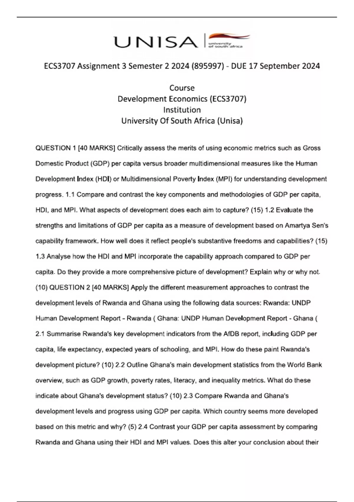 ECS3707 Assignment 3 (COMPLETE ANSWERS) Semester 2 2024 (895997) - DUE 17 September 2024 Course Development Economics (ECS3707) Institution University Of South Africa (Unisa) Book Development Economics