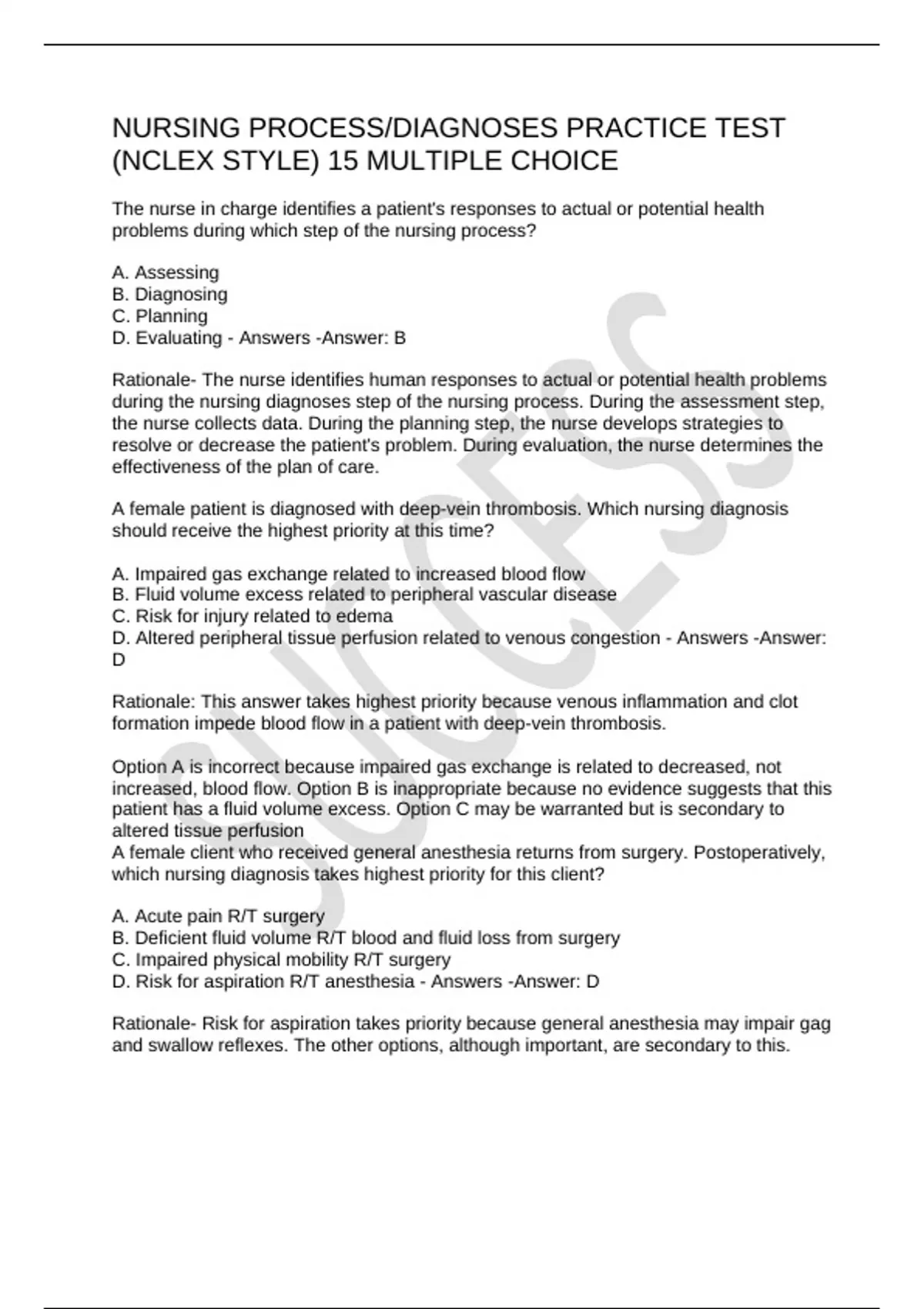 NURSING PROCESS/DIAGNOSES PRACTICE TEST (NCLEX STYLE) 15 MULTIPLE CHOICE
