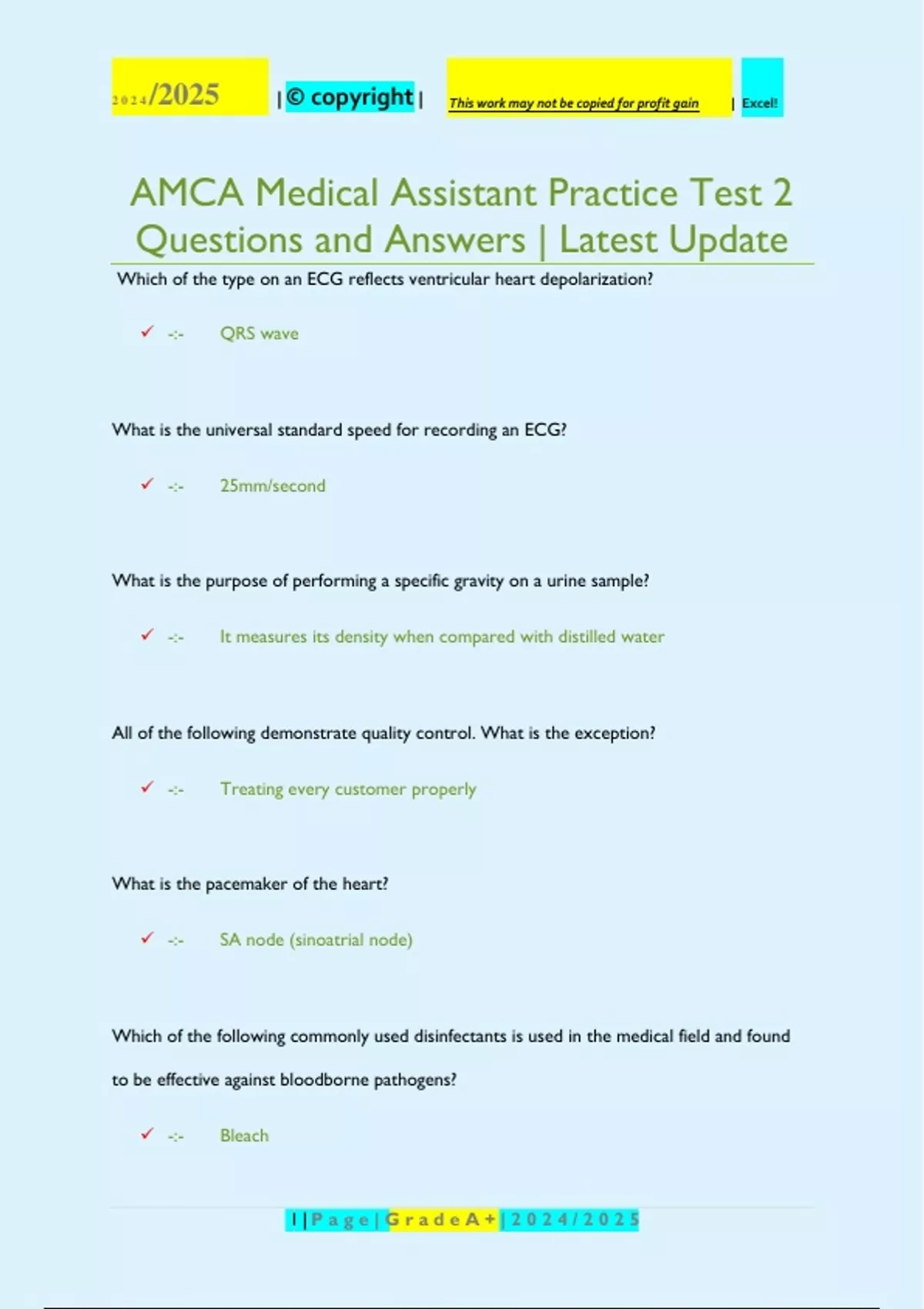 Which of the type on an ECG reflects ventricular heart depolarization? -:- QRS wave What is the universal standard speed for recording an ECG? -:- 25mm/second What is the purpose of performing a specific gravity on a urine sample? -:- It measures its density when compared with distilled water All of the following demonstrate quality control. What is the exception? -:- Treating every customer properly What is the pacemaker of the heart? -:- SA node (sinoatrial node) Which of the following commonly used disinfectants is used in the medical field and found to be effective against bloodborne pathogens? -:- Bleach 2 | P a g e | G r a d e A + | 2 0 2 4 / 2 0 2 5 2 0 2 4 /2025 | © copyright | This work may not be copied for profit gain | Excel! Which of the following is the appropriate method for disposing of contaminated needles? -:- Place it in bio-hazard sharps container located in the room where used What is the most important step in achieving medical asepsis? -:- Washing Hands Which of the following solutions will help prevent the transmission of hepatitis? -:- Household bleach How often should quality control tests be done? -:- Daily Which organization developed the guidelines for universal precautions? -:- CDC According to OSHA, medical personnel must wear PPE when they have contact with which of the following? -:- Blood To detect pregnancy, either urine or blood serum is tested for the presence of which of the following? 3 | P a g e | G r a d e A + | 2 0 2 4 / 2 0 2 5 2 0 2 4 /2025 | © copyright | This work may not be copied for profit gain | Excel! -:- HCG hormone A bacteriological culture needs to be performed on a collected urine specimen. Which of the following instructions best describe what your patient should do? -:- Void a specimen midstream in a sterile cup A urine specimen was collected and then left standing for more than 1 hour. Bacteria grew, and the pH of the urine became which of the following? -:- Alkaline What is the pH range for normal urine?? -:- 4.5 to 8.0 If a patient normally drinks ten or more 8-oz glasses of water each day, urine would most likely be which color?