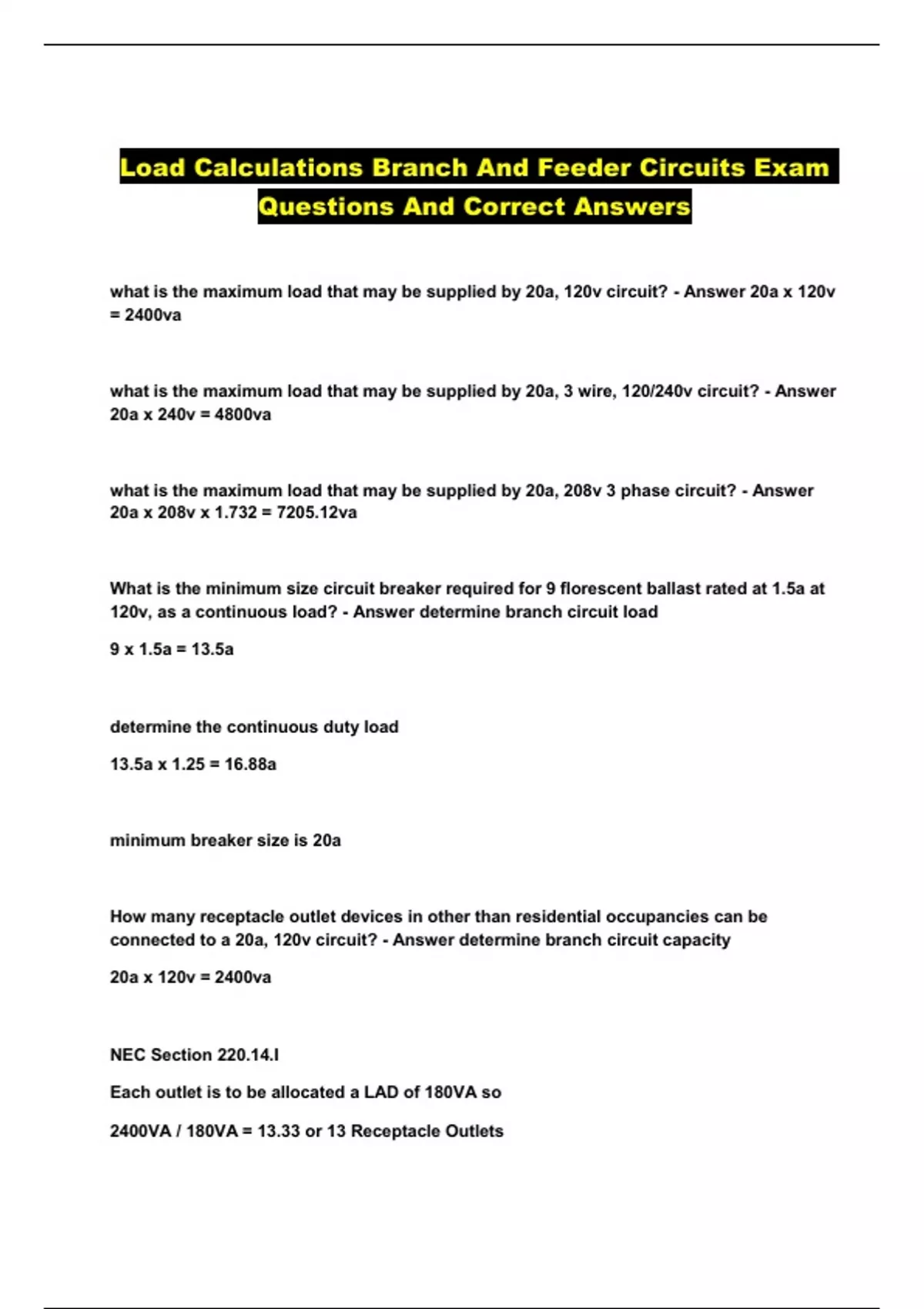 Load Calculations Branch And Feeder Circuits Exam Questions And Correct Answers...