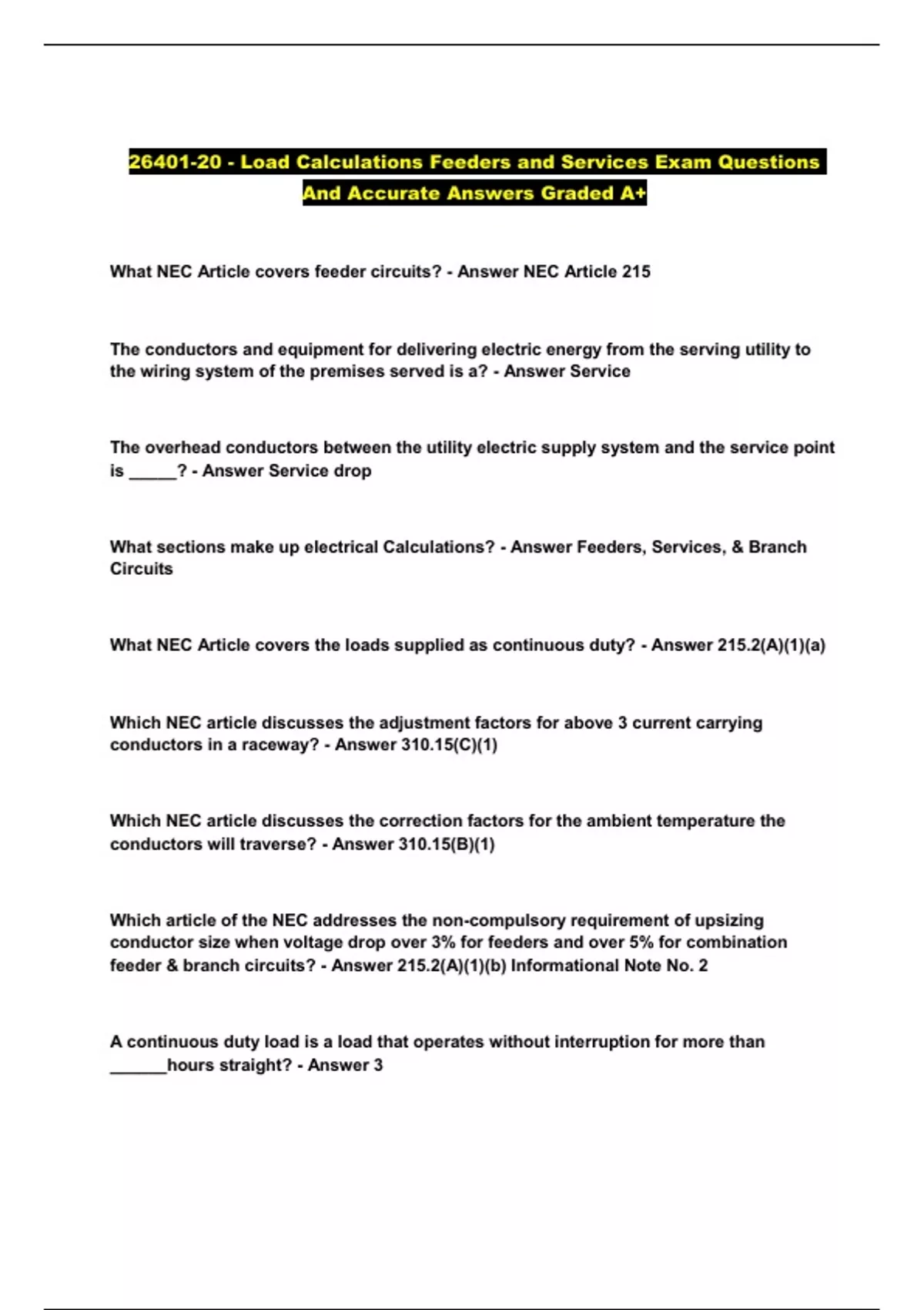 26401-20 - Load Calculations Feeders and Services Exam Questions And Accurate Answers Graded A+