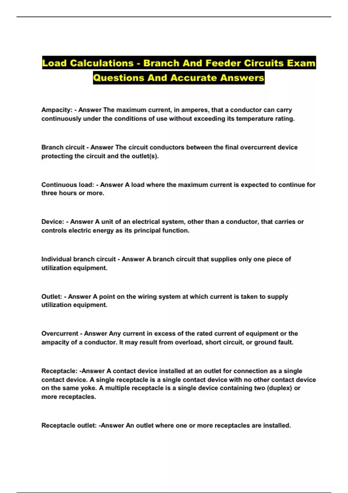 Load Calculations - Branch And Feeder Circuits Exam Questions And Accurate Answers