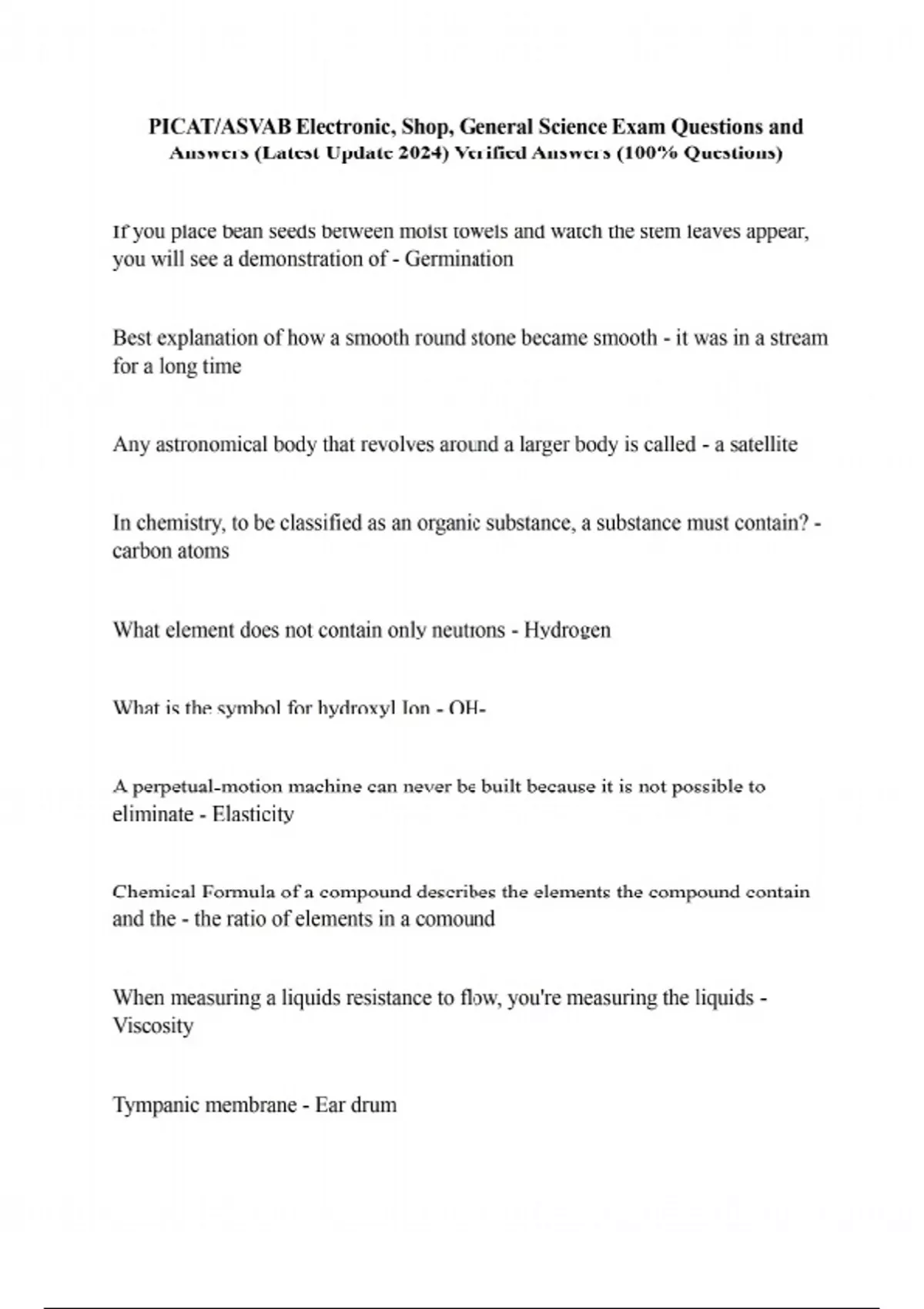 PICAT/ASVAB Electronic, Shop, General Science Exam Questions and Answers (Latest Update 2024) Verified Answers (100% Questions)
